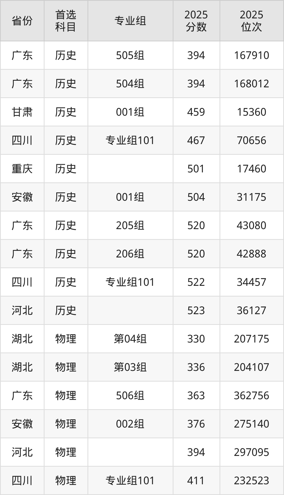 历史类最低分对应地区为广东(505组),录取位次为167910,超专科线179分;最高分对应地区为河北,录取位次为36127,超本科线46分。