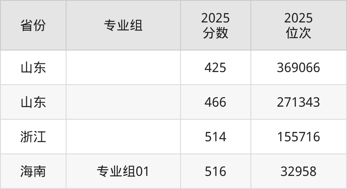 最低分对应地区为山东,录取位次为369066,超二段线275分;最高分对应地区为海南(专业组01),录取位次为32958,超本科线36分。