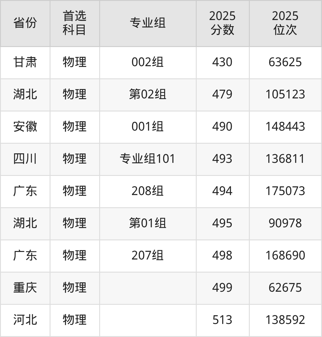 物理类最低分对应地区为湖北(第04组),录取位次为207175;最高分对应地区为河北,录取位次为138592,超本科线54分。