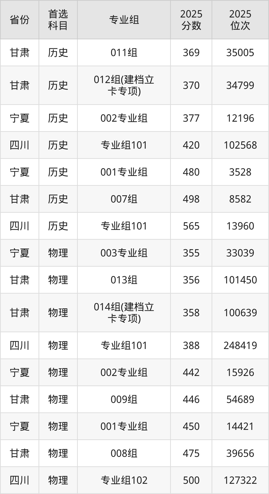 物理类:008组475分、39656名,009组446分、54689名,013组356分、101450名,014组(建档立卡专项)358分、100639名;