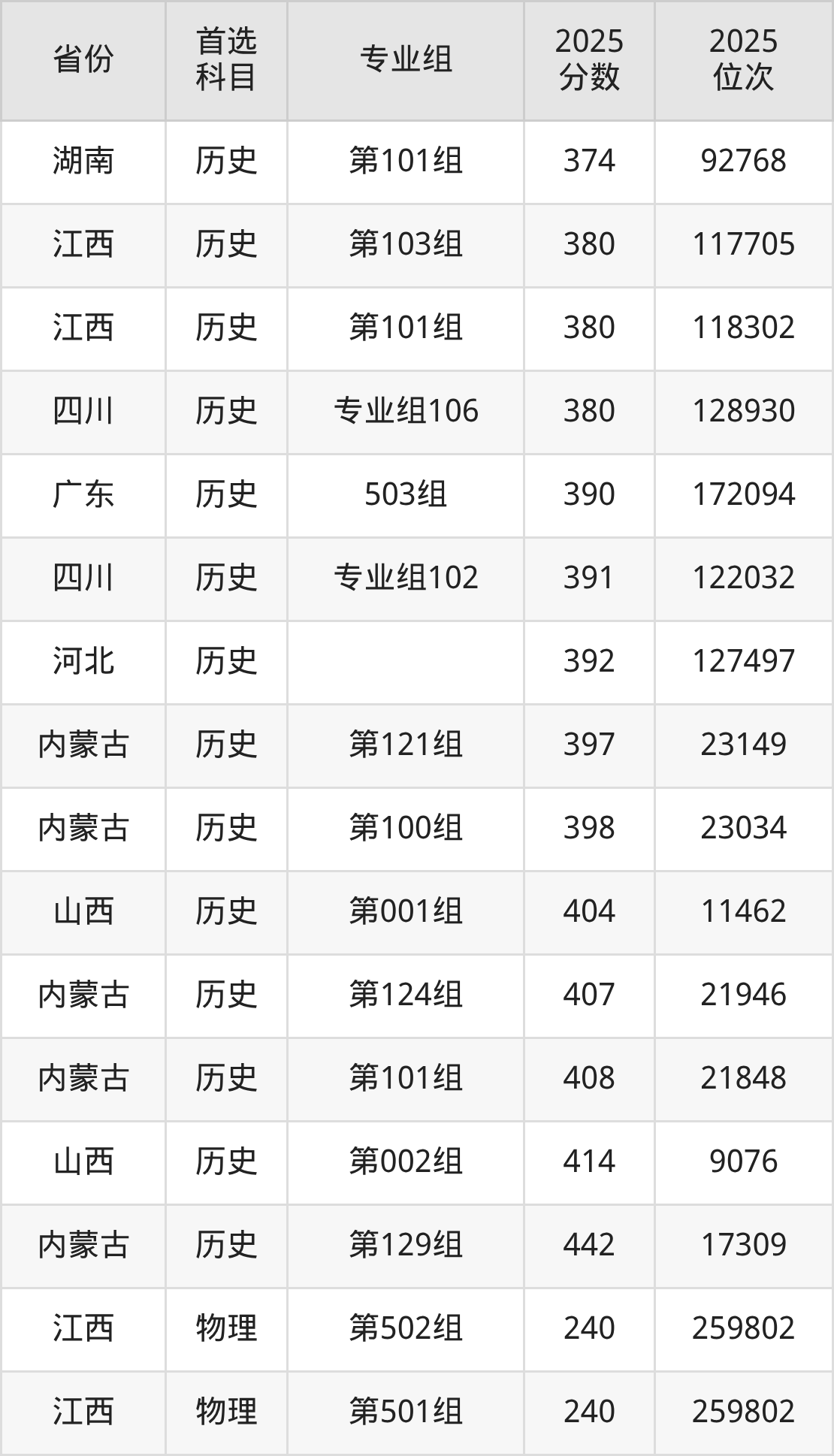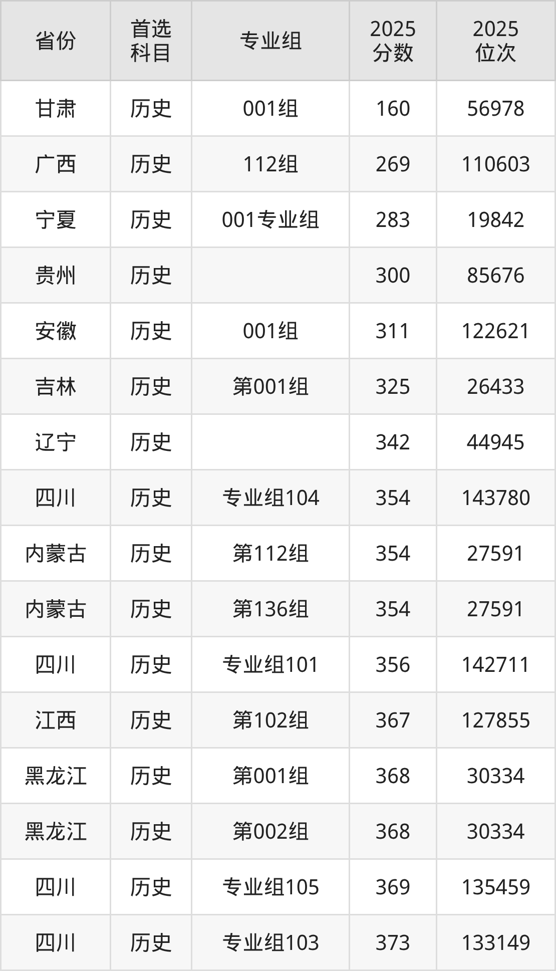 历史类最低分对应地区为甘肃(001组),录取位次为56978;最高分对应地区为内蒙古(第129组),录取位次为17309,超专科线282分。
