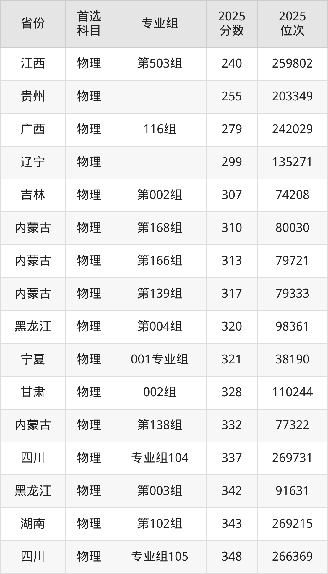 物理类最低分对应地区为江西(第502组),录取位次为259802;最高分对应地区为内蒙古(第152组),录取位次为61601,超专科线239分。