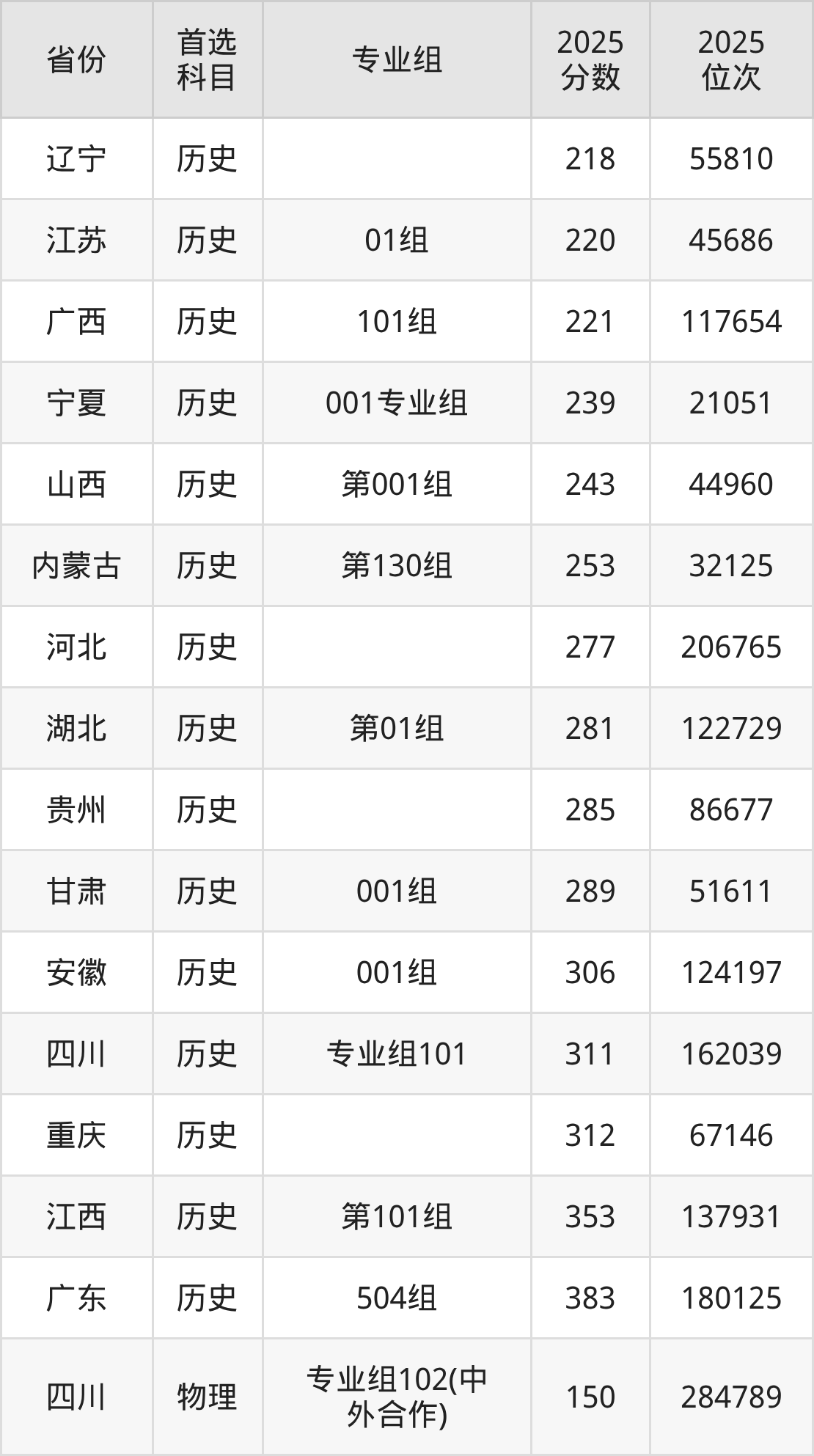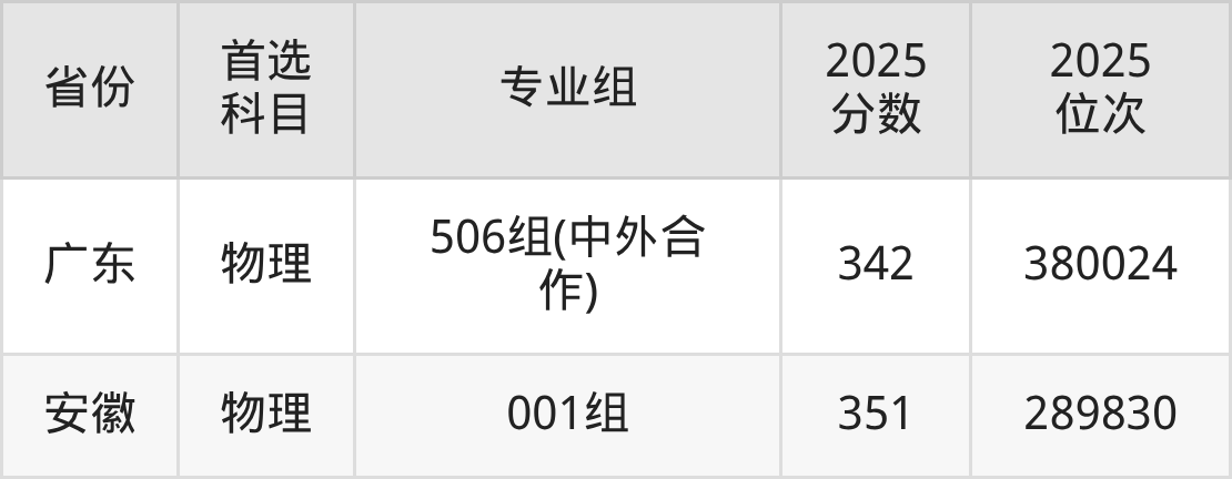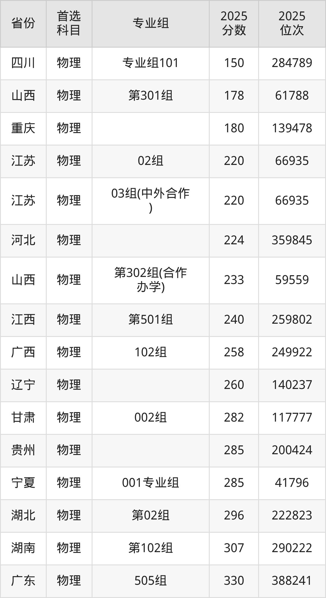 物理类最低分对应地区为四川(专业组102(中外合作)),录取位次为284789;最高分对应地区为安徽(001组),录取位次为289830,超专科线151分。