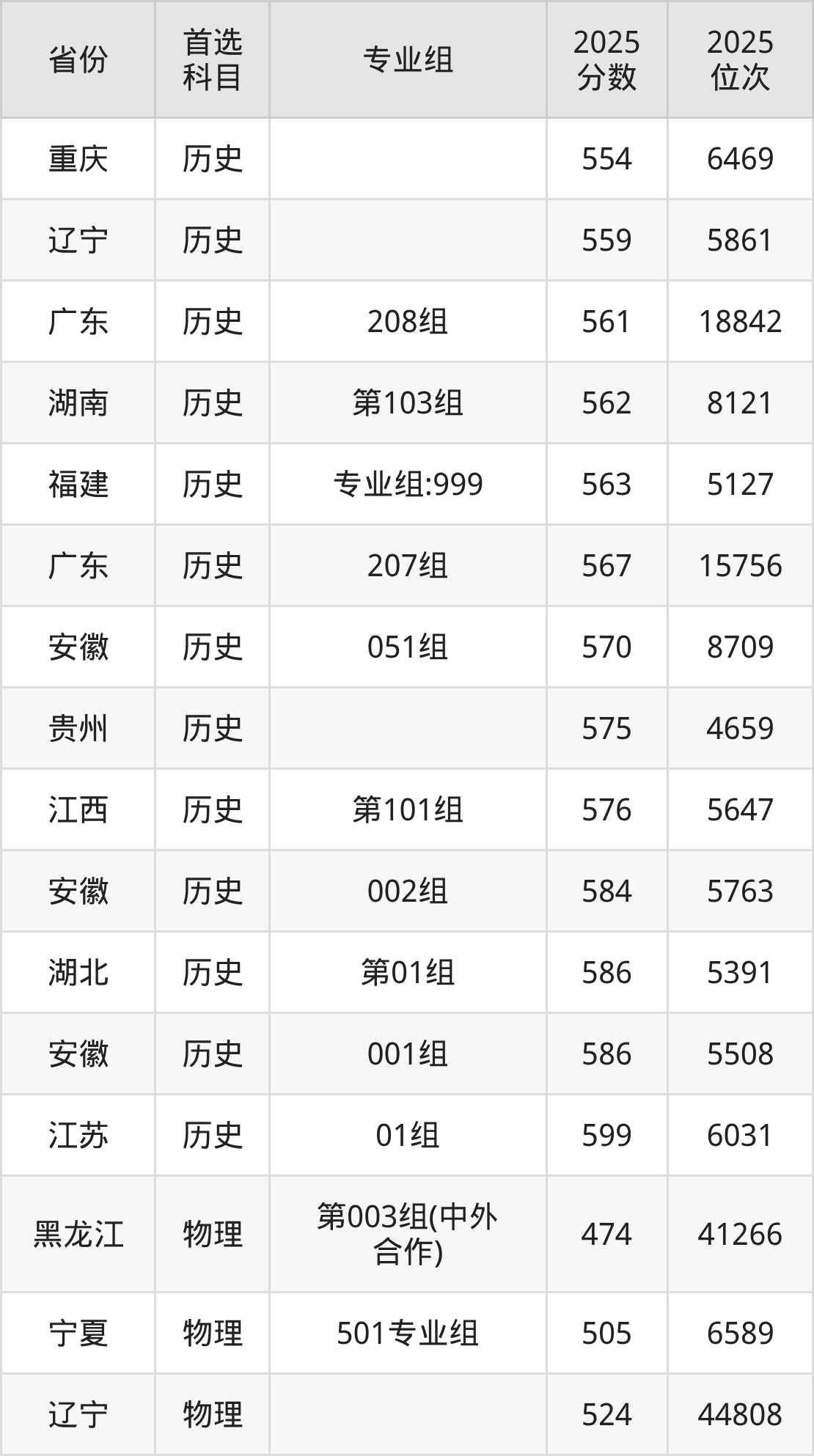 历史类最低分对应地区为重庆,录取位次为6469,超本科线116分;最高分对应地区为江苏(01组),录取位次为6031,超本科线117分。