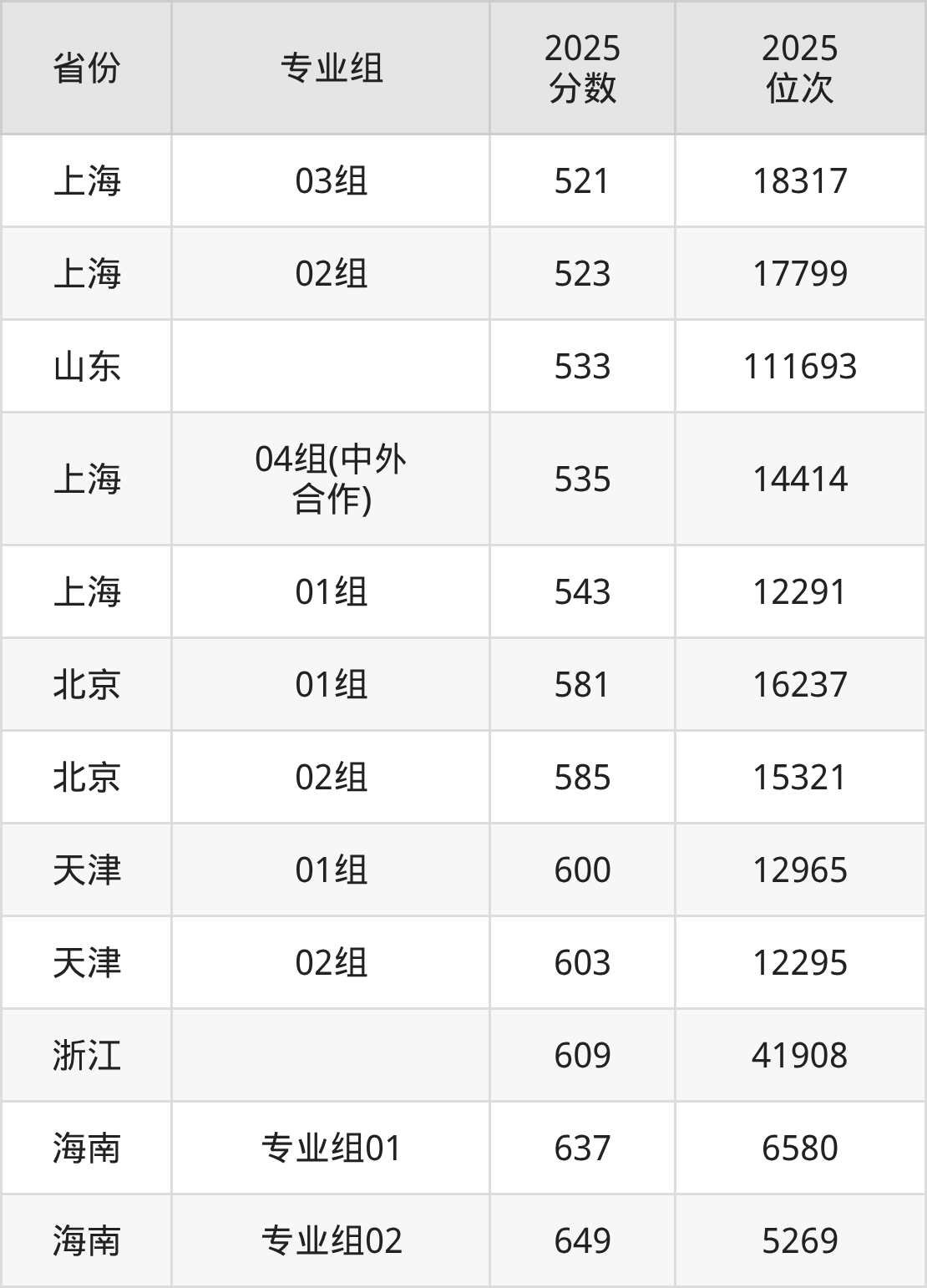 最低分对应地区为上海(03组),录取位次为18317,超本科线119分;最高分对应地区为海南(专业组02),录取位次为5269,超本科线169分。
