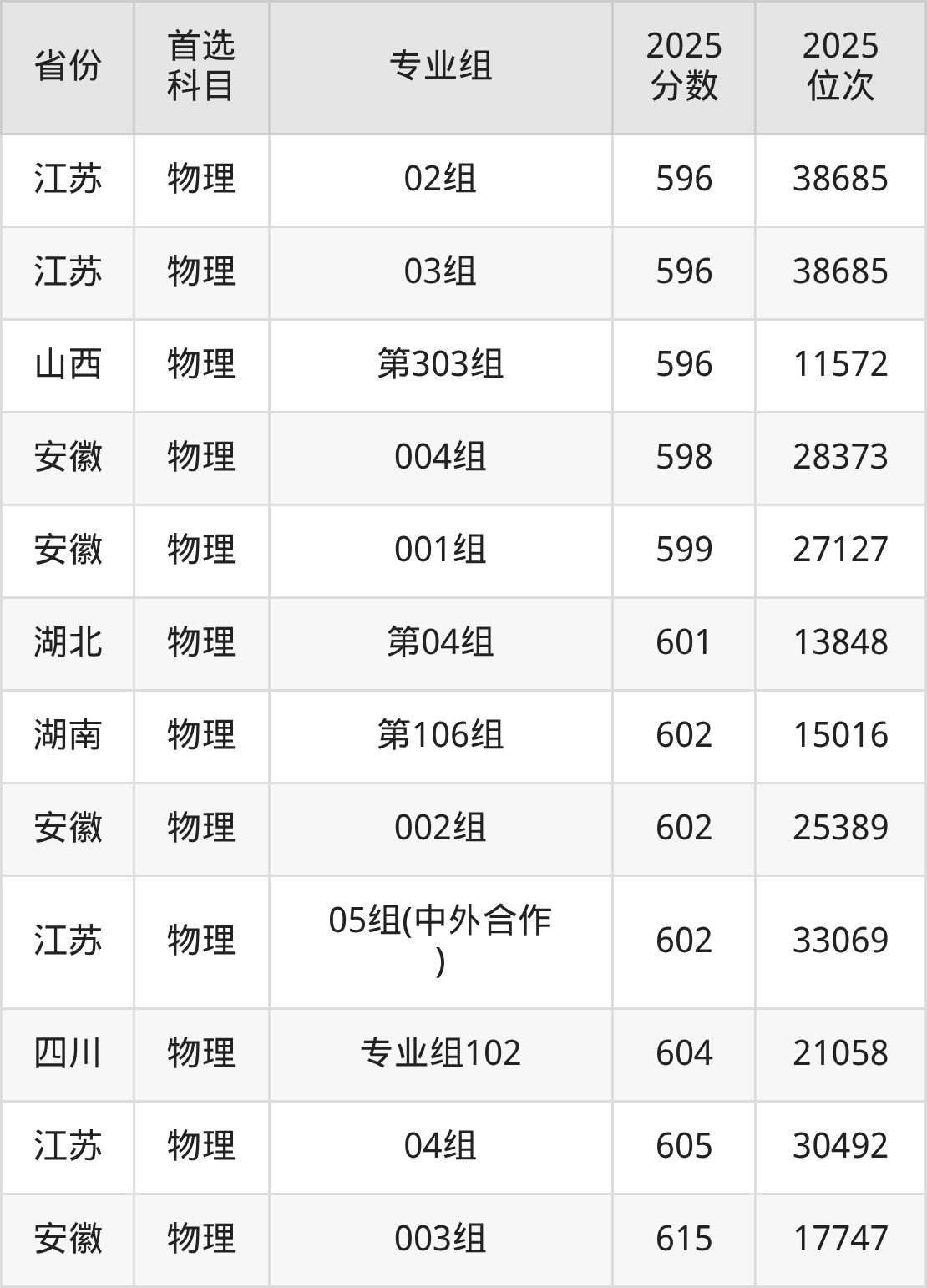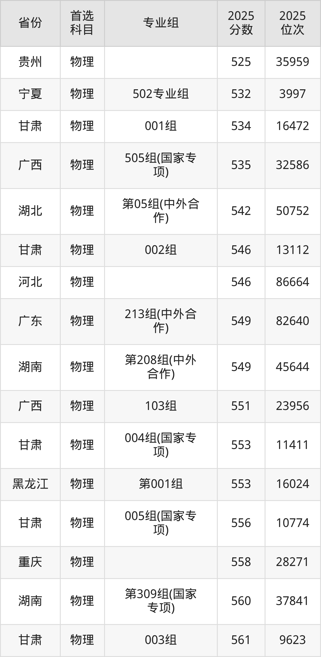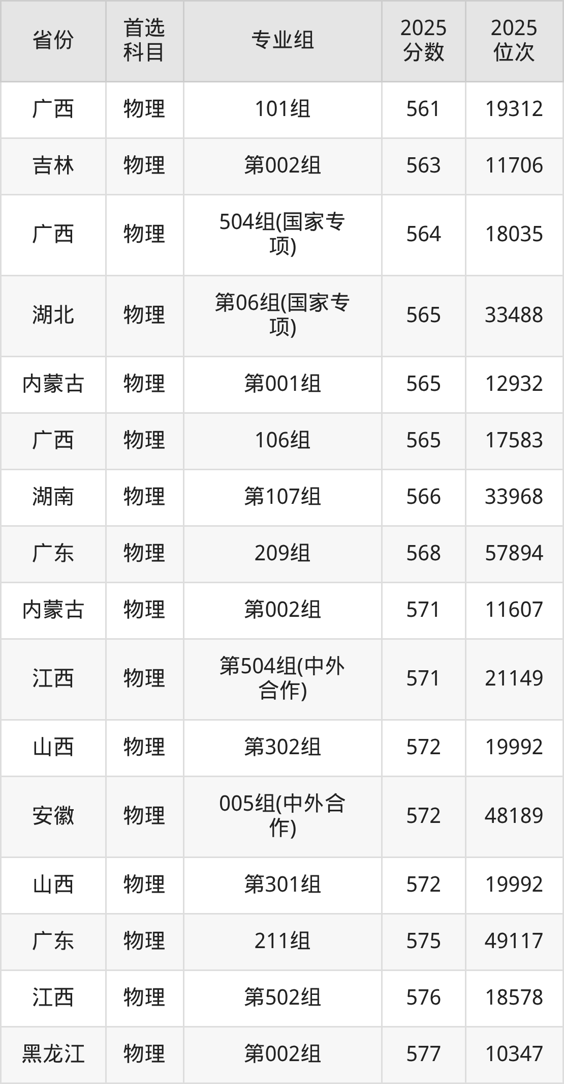 物理类最低分对应地区为黑龙江(第003组(中外合作)),录取位次为41266,超本科线114分;最高分对应地区为安徽(003组),录取位次为17747,超本科线154分。