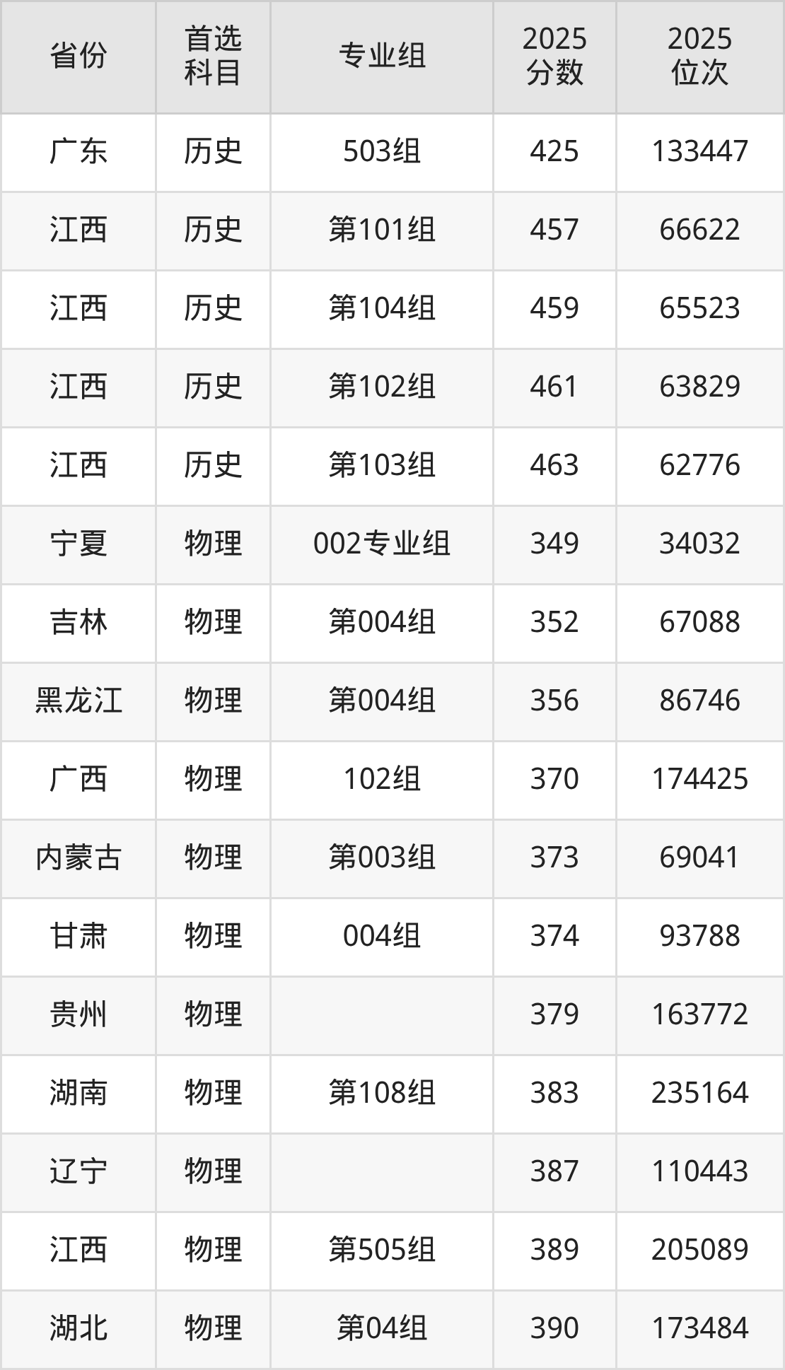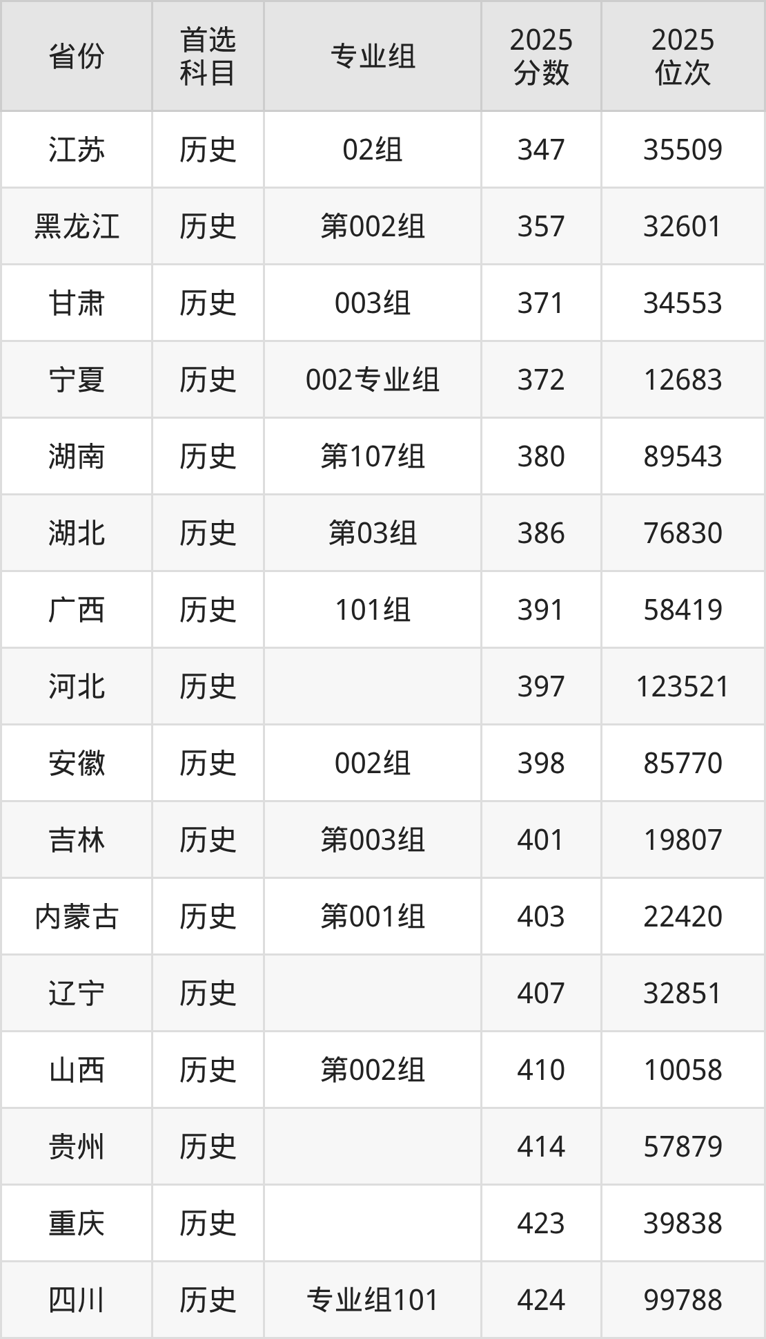 历史类最低分对应地区为江苏(02组),录取位次为35509,超专科线127分;最高分对应地区为江西(第103组),录取位次为62776,超专科线173分。