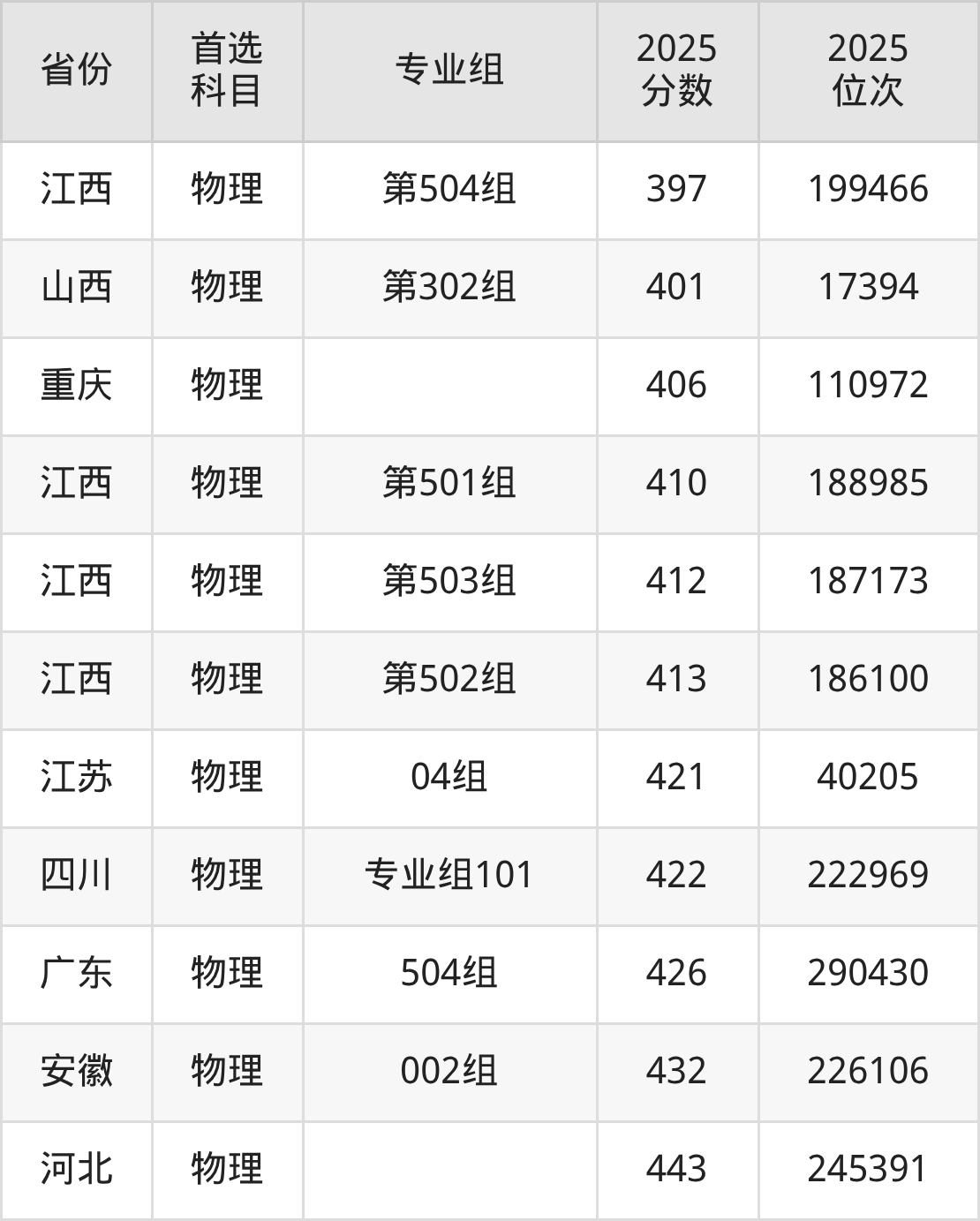 物理类最低分对应地区为宁夏(002专业组),录取位次为34032,超专科线199分;最高分对应地区为河北,录取位次为245391,超专科线243分。