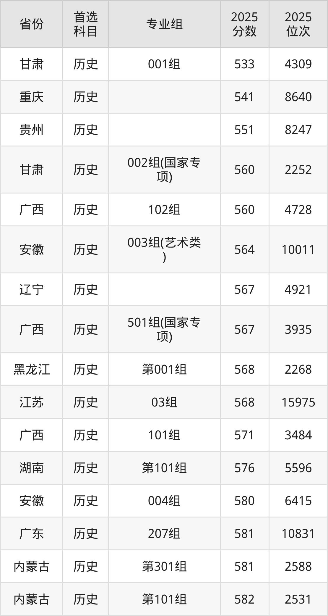 历史类最低分对应地区为甘肃(001组),录取位次为4309,超本科线121分;最高分对应地区为江苏(02组),录取位次为3605,超本科线129分。