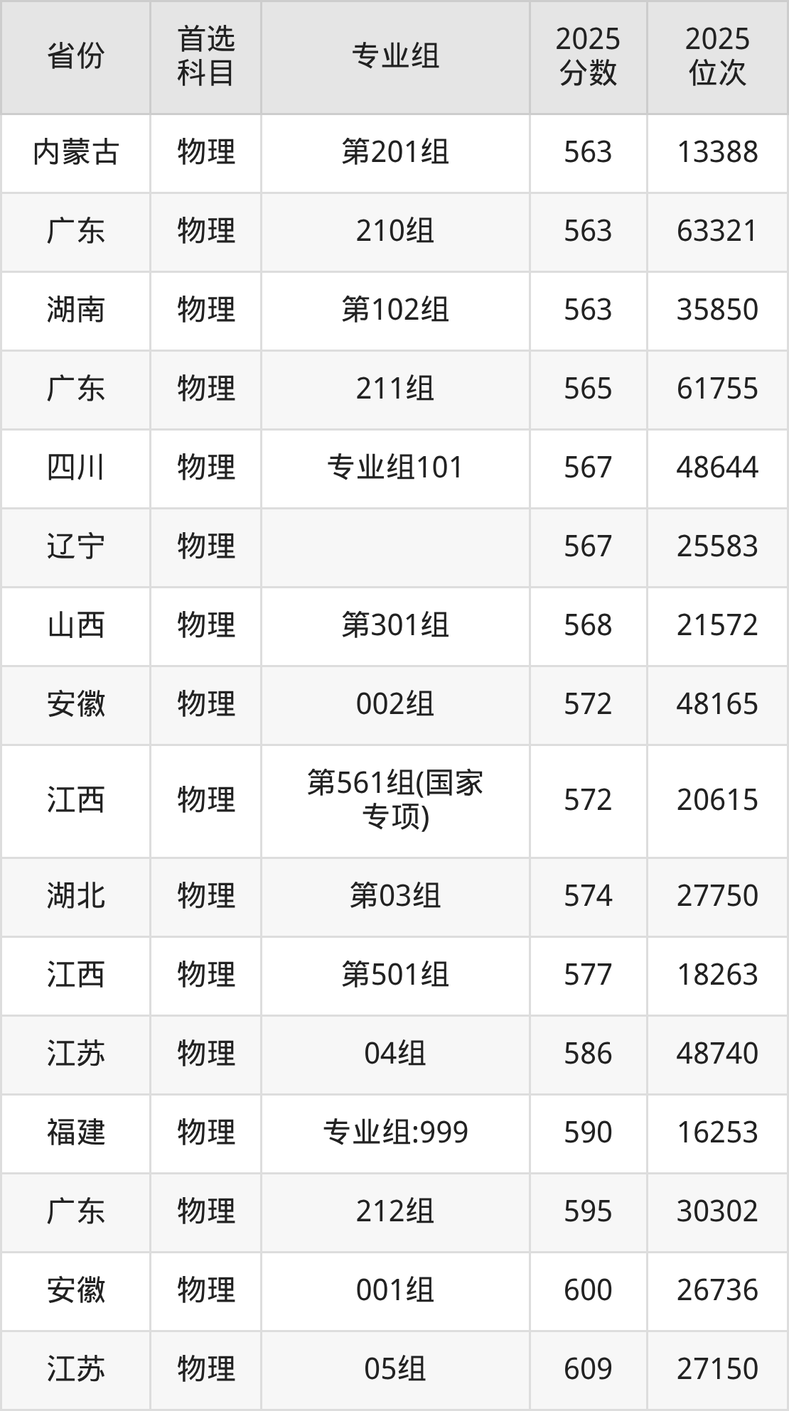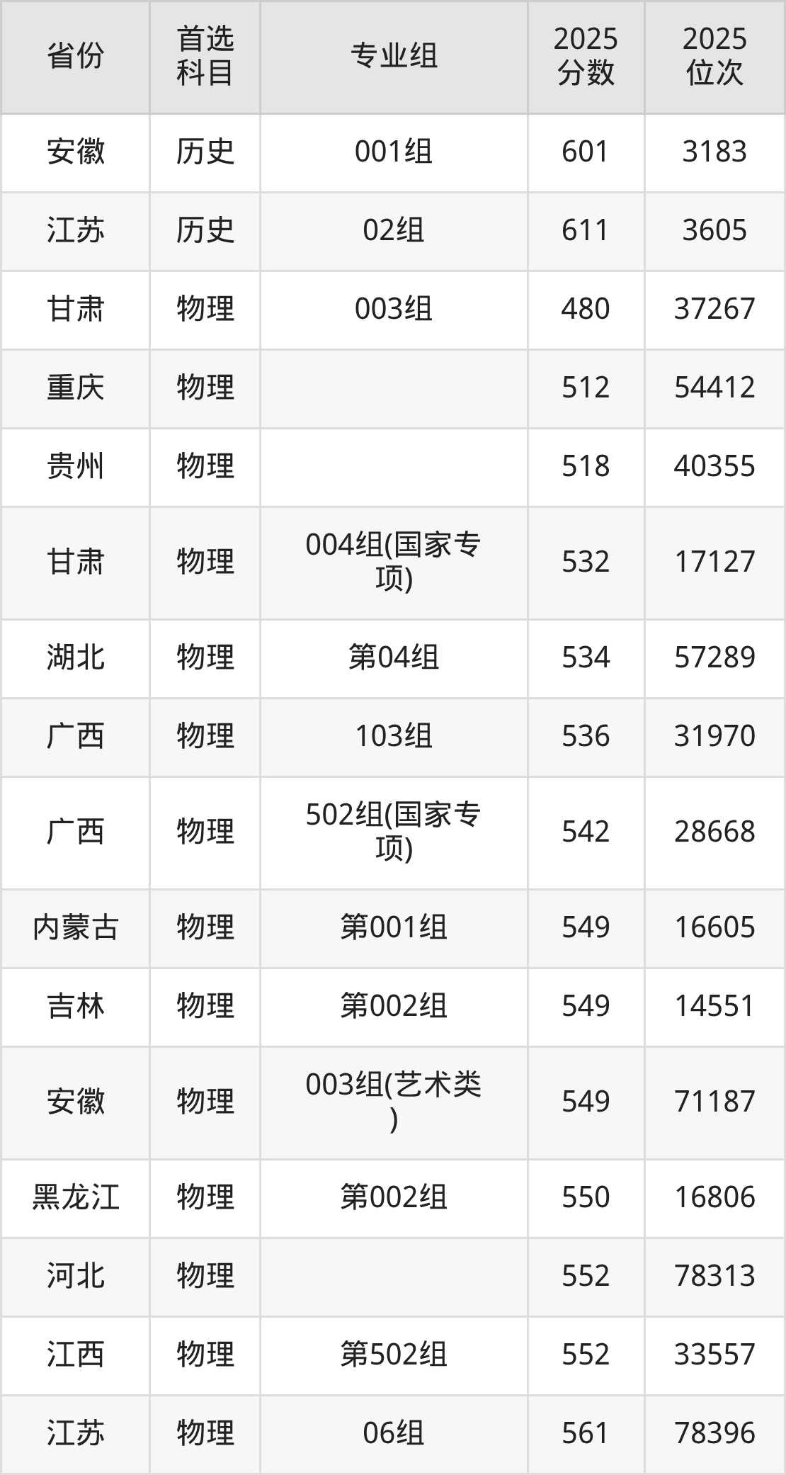 物理类最低分对应地区为甘肃(003组),录取位次为37267,超本科线106分;最高分对应地区为江苏(05组),录取位次为27150,超本科线146分。