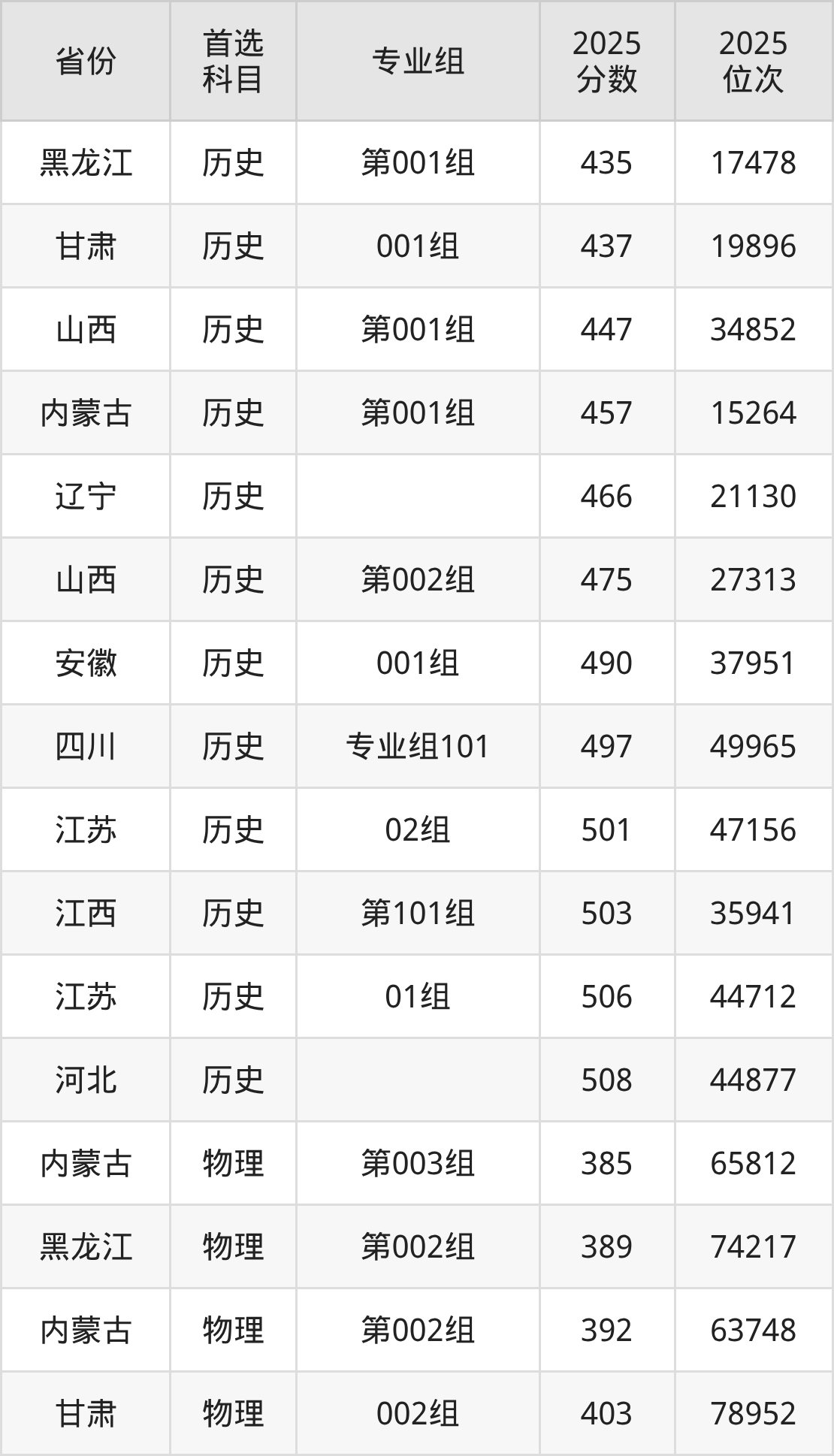 历史类最低分对应地区为黑龙江(第001组),录取位次为17478;最高分对应地区为河北,录取位次为44877,超本科线31分。