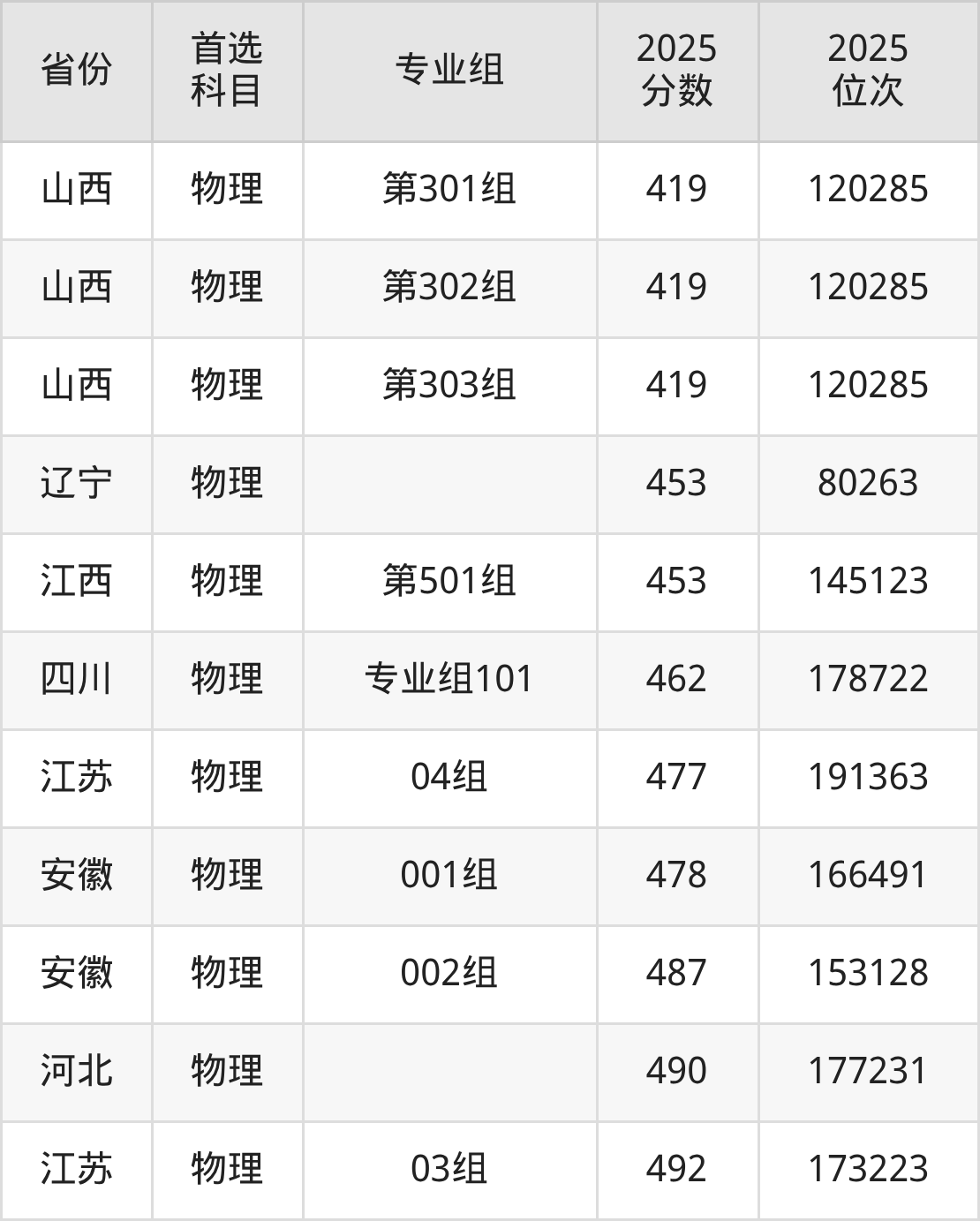 物理类:第301组419分、120285名,第302组419分、120285名,第303组419分、120285名;