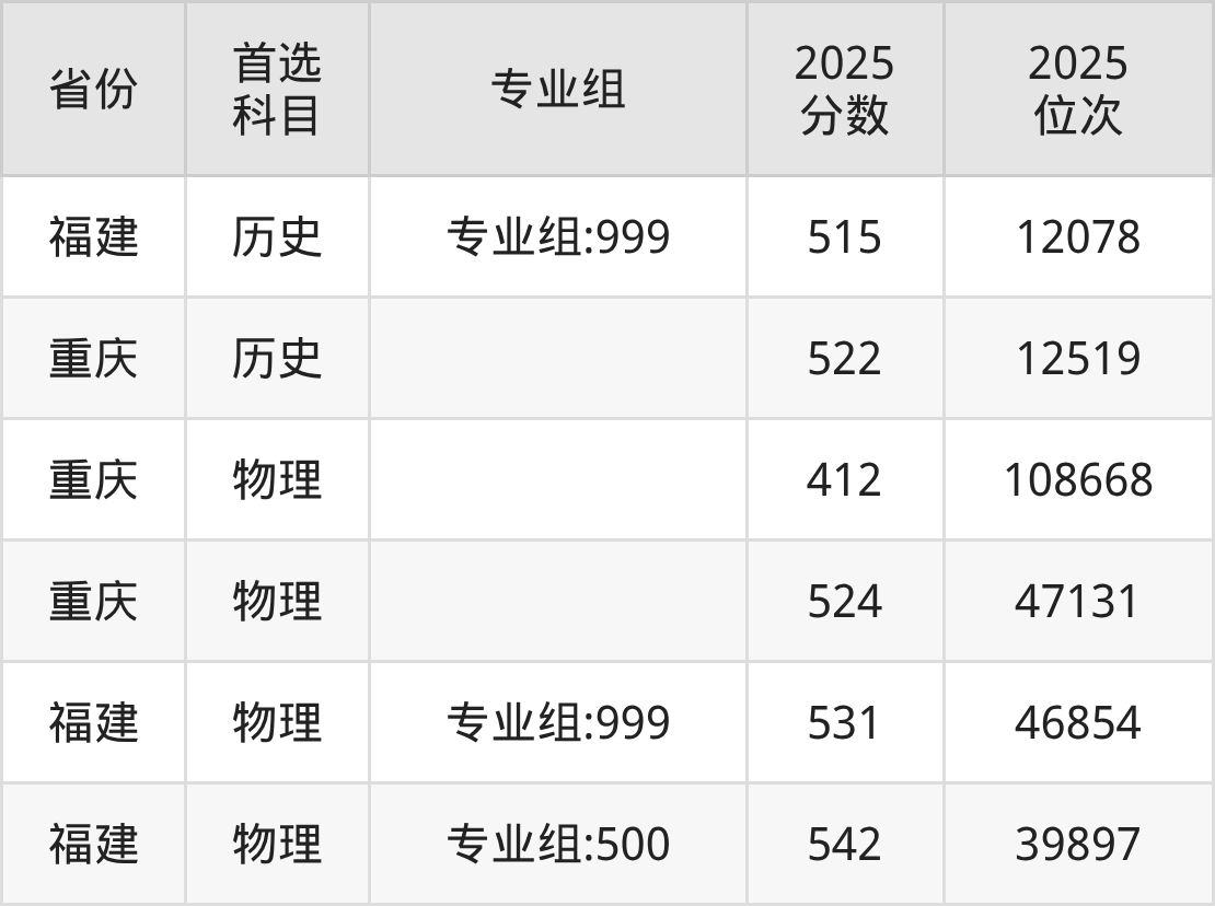 物理类最低分对应地区为重庆,录取位次为108668,超专科线232分;最高分对应地区为福建(专业组:500),录取位次为39897,超本科线101分。
