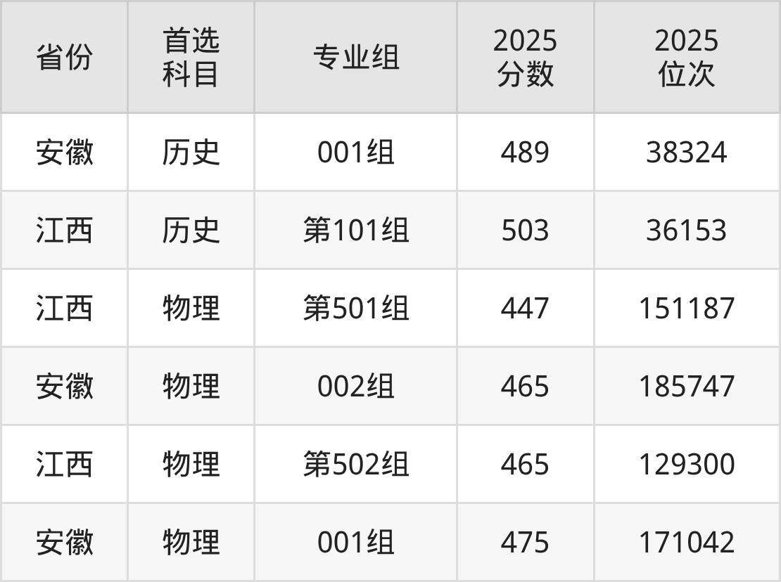 历史类最低分对应地区为安徽(001组),录取位次为38324,超本科线12分;最高分对应地区为江西(第101组),录取位次为36153,超本科线17分。