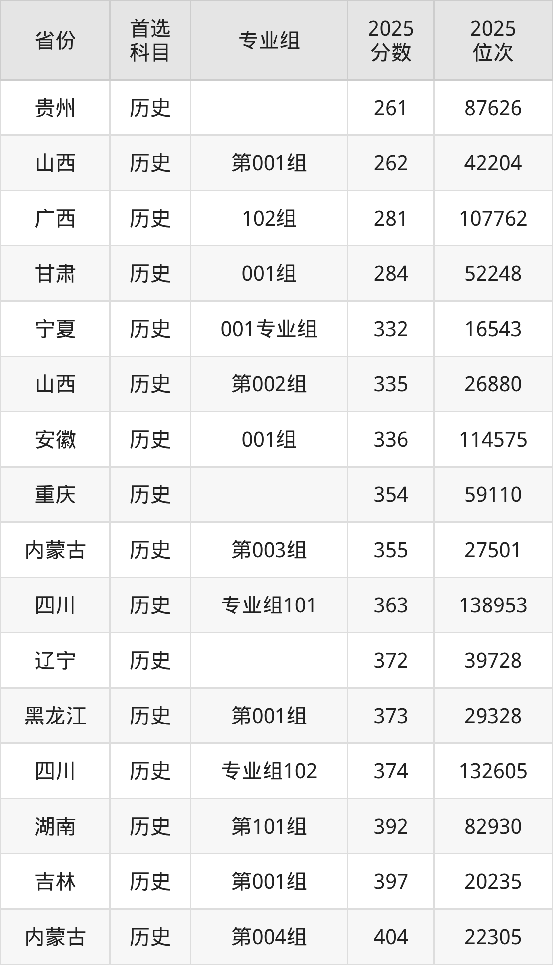 历史类最低分对应地区为贵州,录取位次为87626,超专科线81分;最高分对应地区为河北,录取位次为89129,超专科线242分。