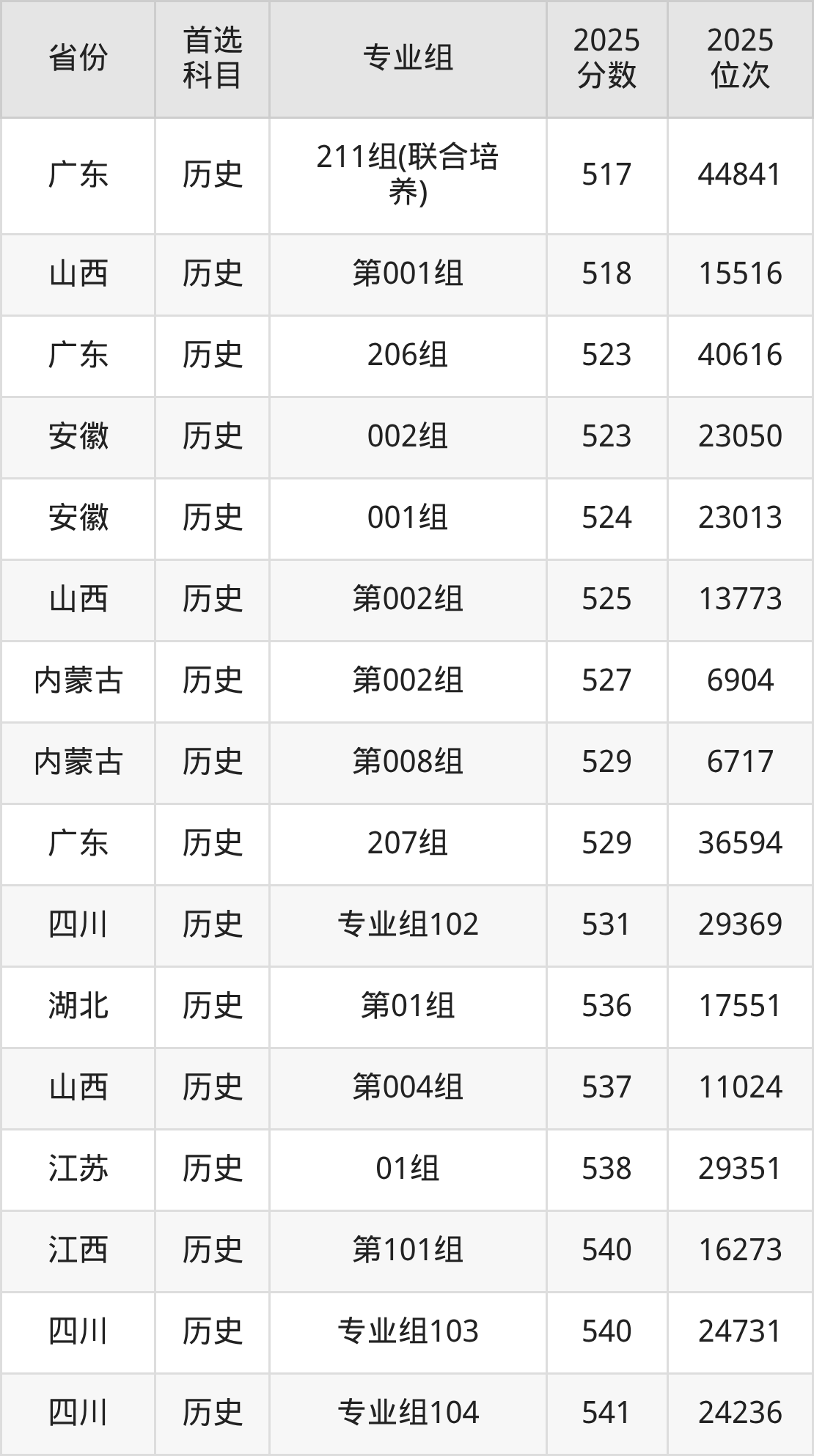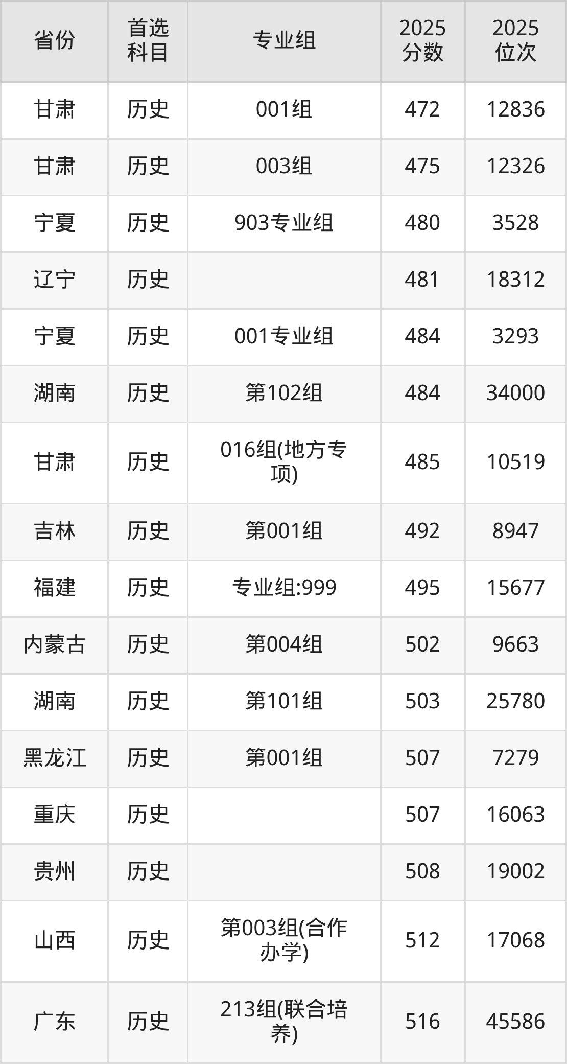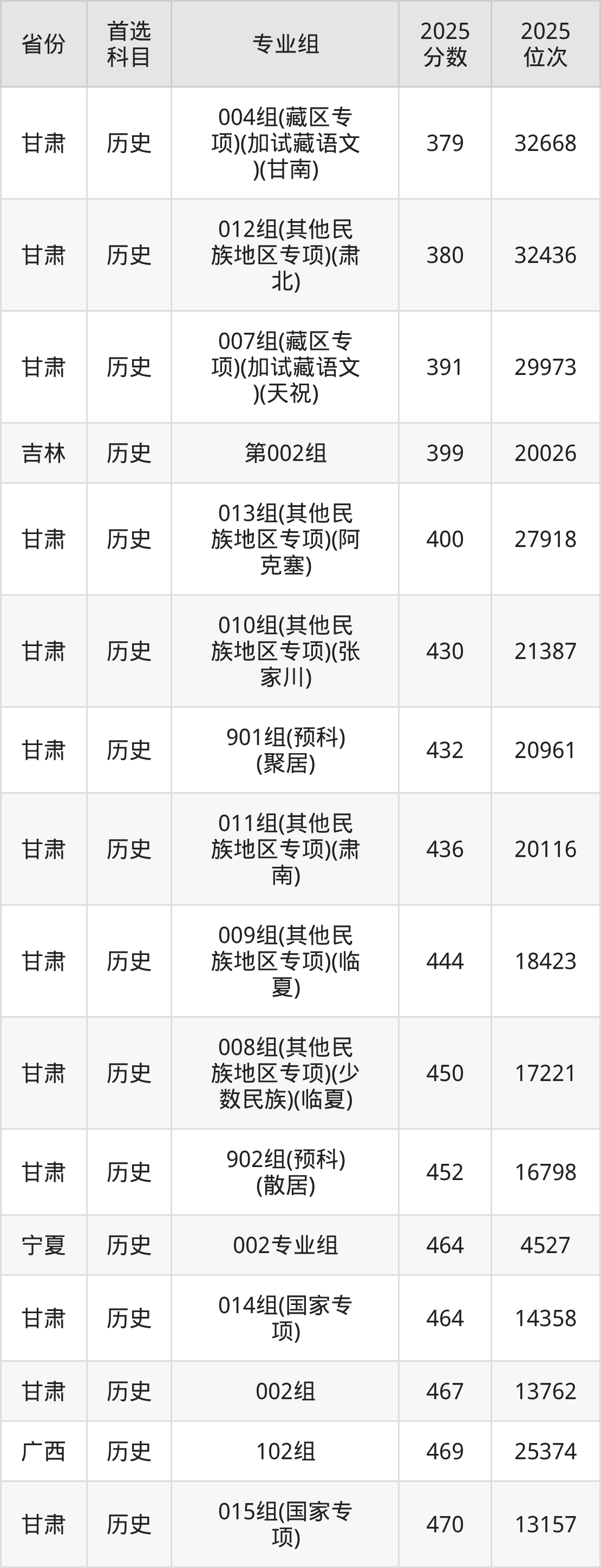 历史类:001组476分、13100名,002组468分、14505名,003组479分、12544名,004组(藏区专项)(少数民族)(甘南)447分、18543名,005组(藏区专项)(甘南)457分、16526名,006组(藏区专项)(天祝)428分、22689名,008组(其他民族地区专项)(少数民族)(临夏)436分、20897名,009组(其他民族地区专项)(临夏)454分、17115名,010组(其他民族地区专项)(张家川)426分、23133名,011组(其他民族地区专项)(肃南)443分、19362名,012组(其他民族地区专项)(肃北)386分、32698名,013组(其他民族地区专项)(阿克塞)438分、20417名,014组(其他民族地区专项)(积石山县)388分、32182名,015组(国家专项)492分、10320名,016组(国家专项)470分、14144名,017组(地方专项)459分、16156名,901组(预科)(聚居)426分、23133名,902组(预科)(散居)452分、17503名;