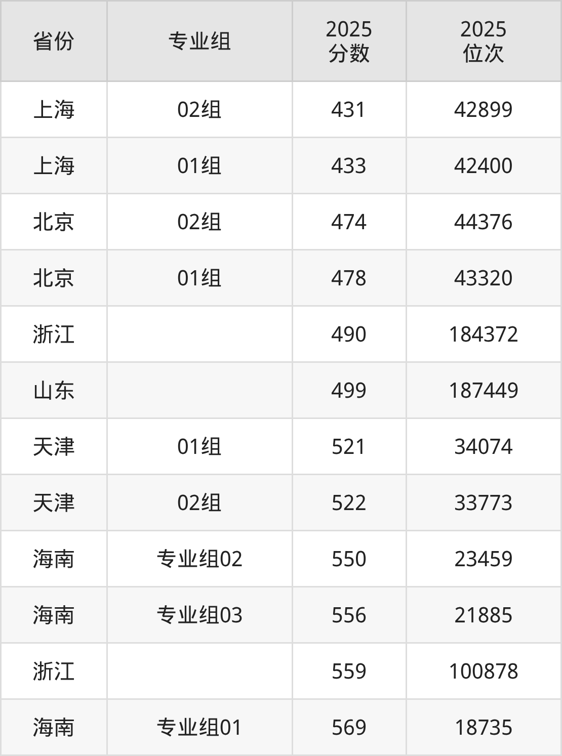 最低分对应地区为上海(02组),录取位次为42899,超本科线29分;最高分对应地区为海南(专业组01),录取位次为18735,超本科线89分。