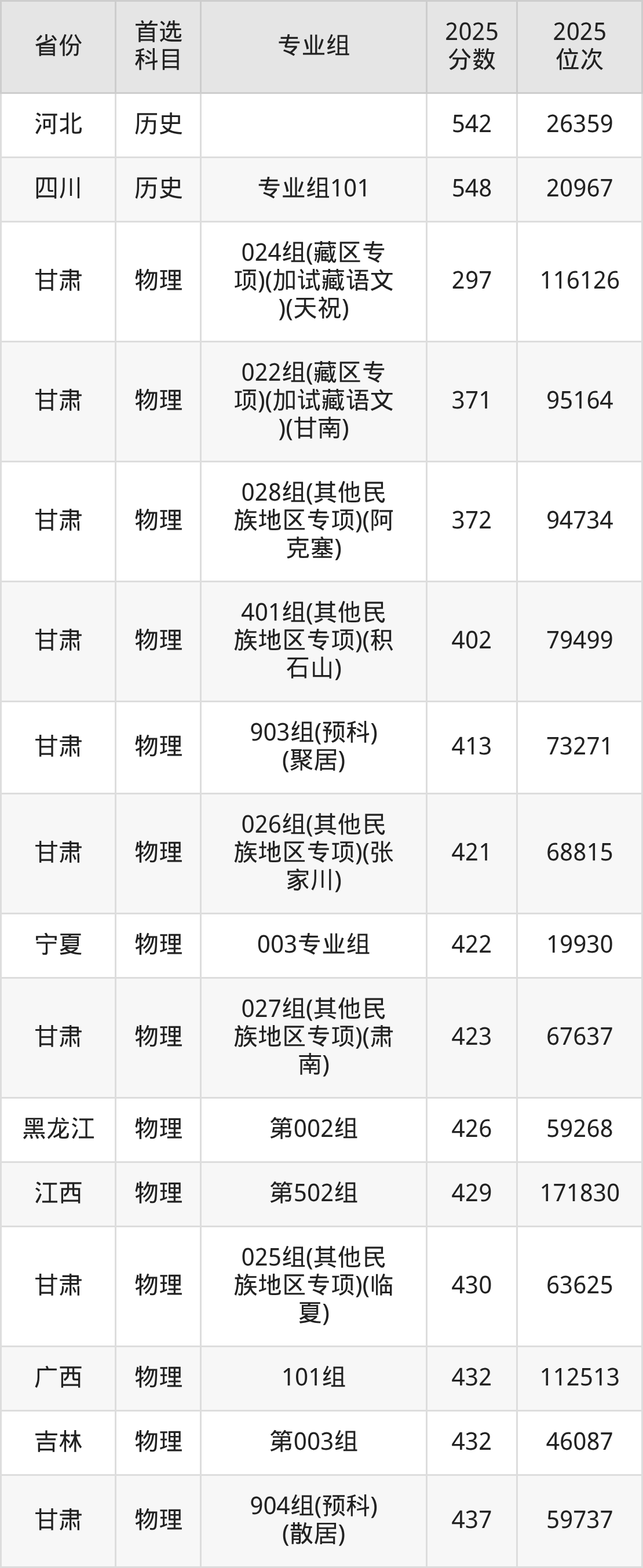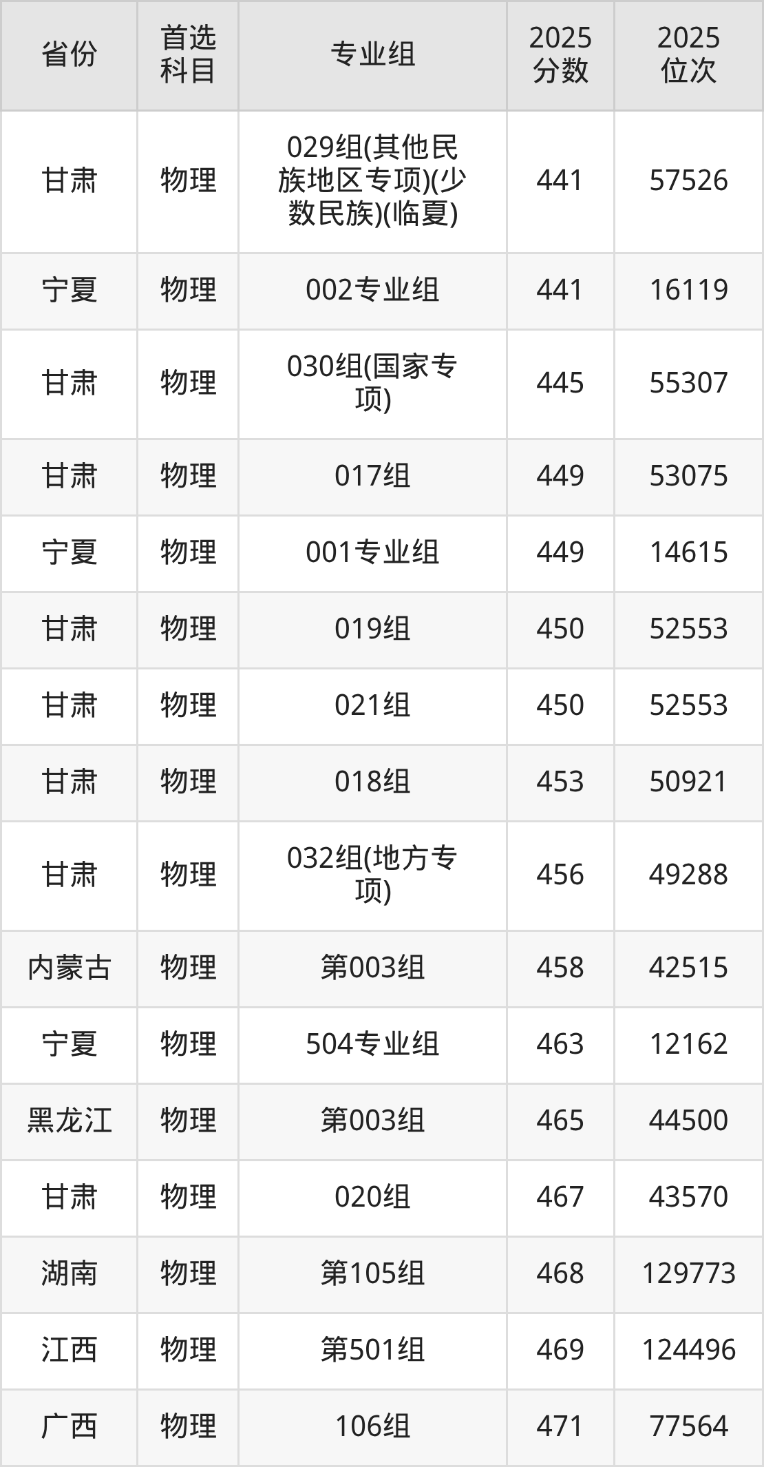物理类:017组449分、53075名,018组453分、50921名,019组450分、52553名,020组467分、43570名,021组450分、52553名,022组(藏区专项)(加试藏语文)(甘南)371分、95164名,024组(藏区专项)(加试藏语文)(天祝)297分、116126名,025组(其他民族地区专项)(临夏)430分、63625名,026组(其他民族地区专项)(张家川)421分、68815名,027组(其他民族地区专项)(肃南)423分、67637名,028组(其他民族地区专项)(阿克塞)372分、94734名,029组(其他民族地区专项)(少数民族)(临夏)441分、57526名,030组(国家专项)445分、55307名,031组(国家专项)483分、35900名,032组(地方专项)456分、49288名,033组(地方专项)481分、36787名,401组(其他民族地区专项)(积石山)402分、79499名,903组(预科)(聚居)413分、73271名,904组(预科)(散居)437分、59737名;