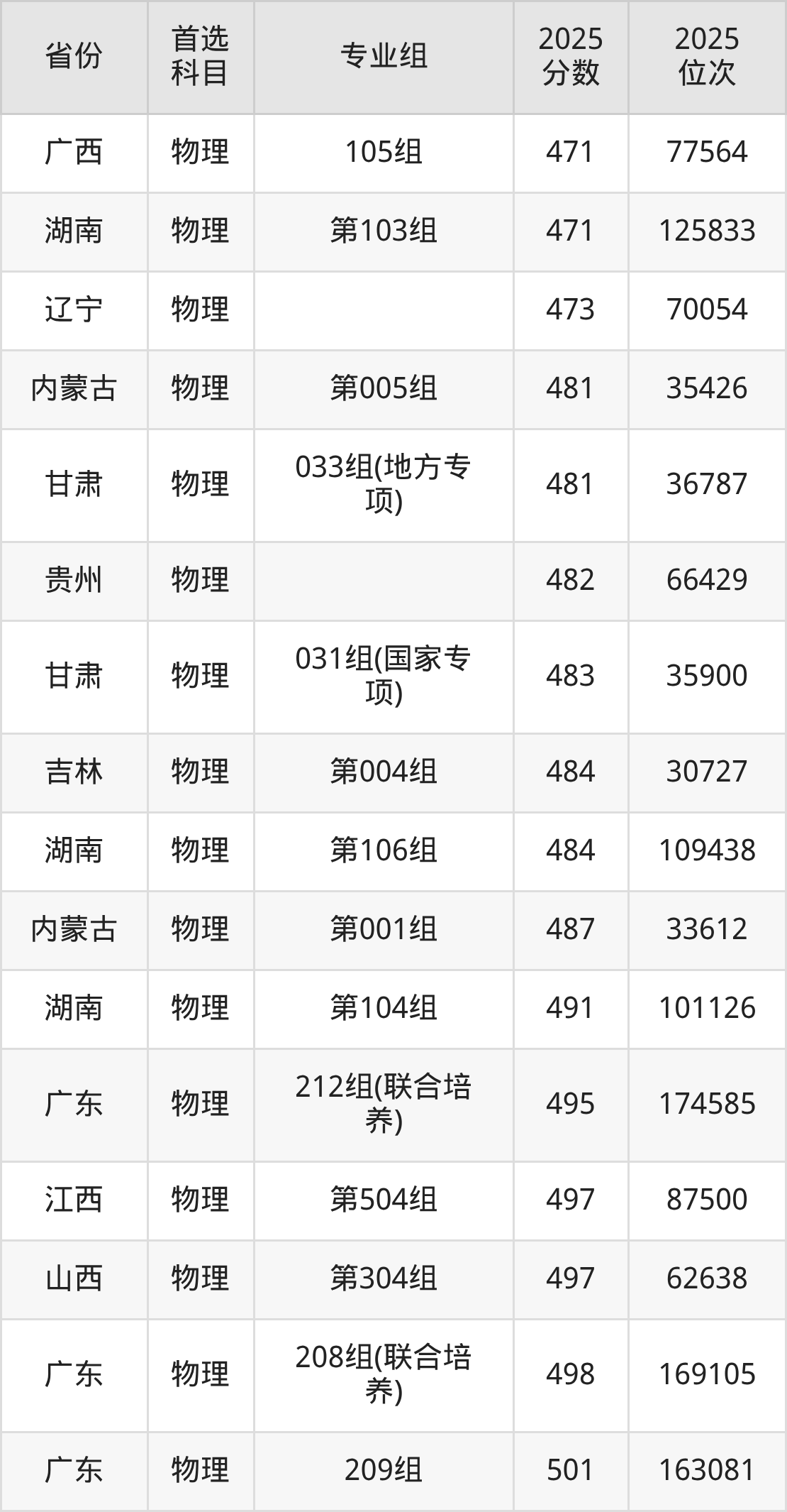 物理类:018组454分、53483名,019组(中外合作)440分、60279名,021组475分、43850名,022组467分、47398名,023组(藏区专项)(少数民族)(甘南)435分、62657名,025组(藏区专项)(天祝)406分、76361名,027组(其他民族地区专项)(少数民族)(临夏)429分、65575名,028组(其他民族地区专项)(临夏)435分、62657名,029组(其他民族地区专项)(张家川)420分、69863名,030组(其他民族地区专项)(肃南)401分、78655名,031组(其他民族地区专项)(阿克塞)346分、99395名,032组(其他民族地区专项)(积石山县)397分、80517名,033组(国家专项)469分、46511名,035组(国家专项)489分、37763名,036组(地方专项)447分、56851名,037组(地方专项)480分、41639名,903组(预科)(聚居)416分、71709名,904组(预科)(散居)434分、63158名;