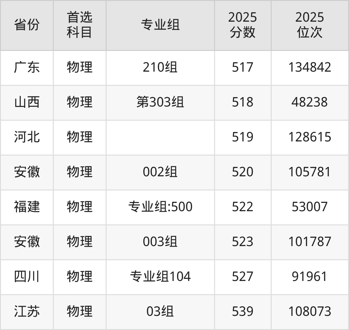 物理类最低分对应地区为甘肃(024组(藏区专项)(加试藏语文)(天祝)),录取位次为116126,低本科线77分;最高分对应地区为江苏(03组),录取位次为108073,超本科线76分。