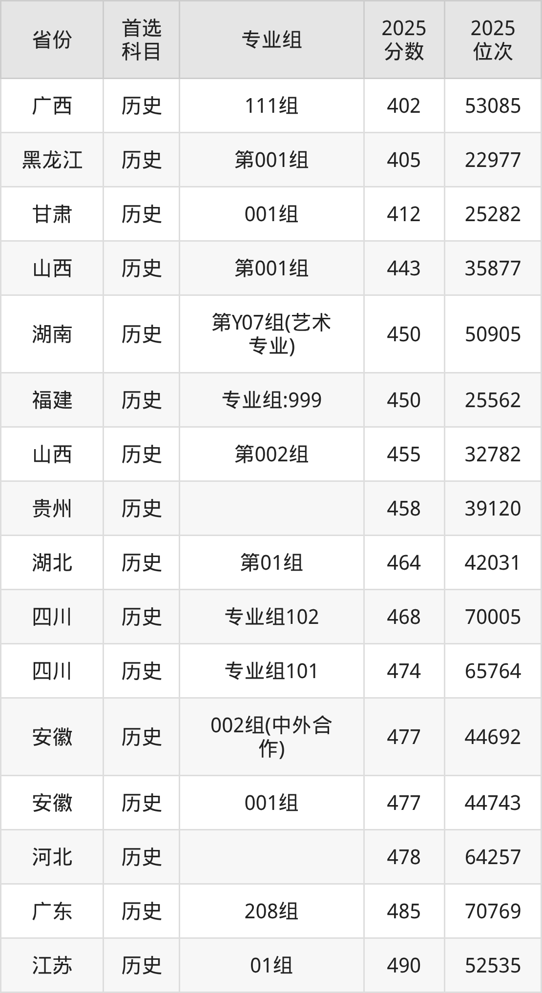 历史类最低分对应地区为广西(111组),录取位次为53085;最高分对应地区为广东(207组),录取位次为59755,超本科线34分。