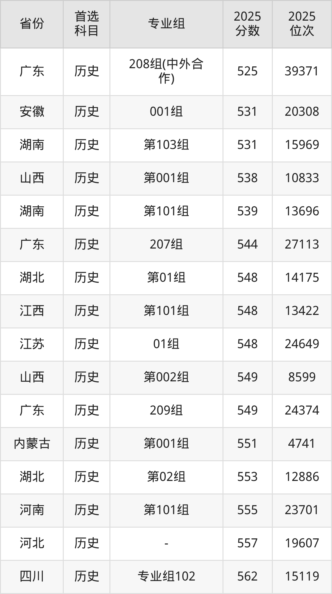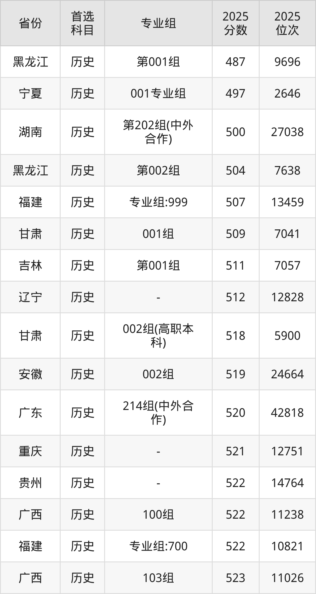 历史类最低分对应地区为黑龙江(第001组),录取位次为9696,超本科线82分;最高分对应地区为四川(专业组101),录取位次为14706,超本科B96分。
