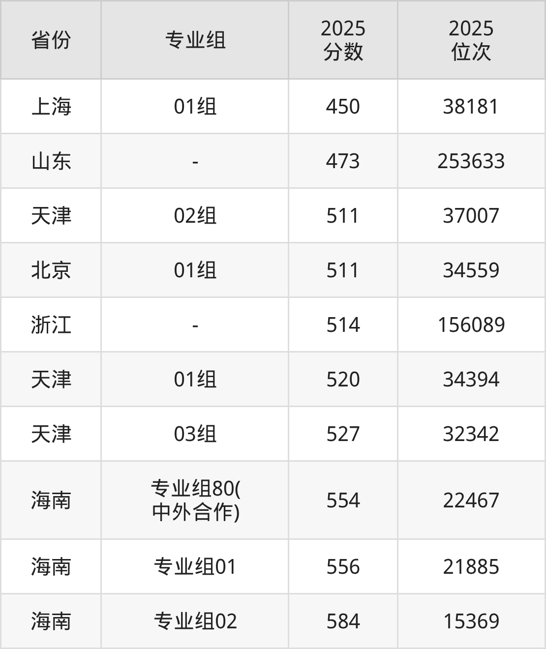 最低分对应地区为上海(01组),录取位次为38181,超本科线48分;最高分对应地区为海南(专业组02),录取位次为15369,超本科线104分。