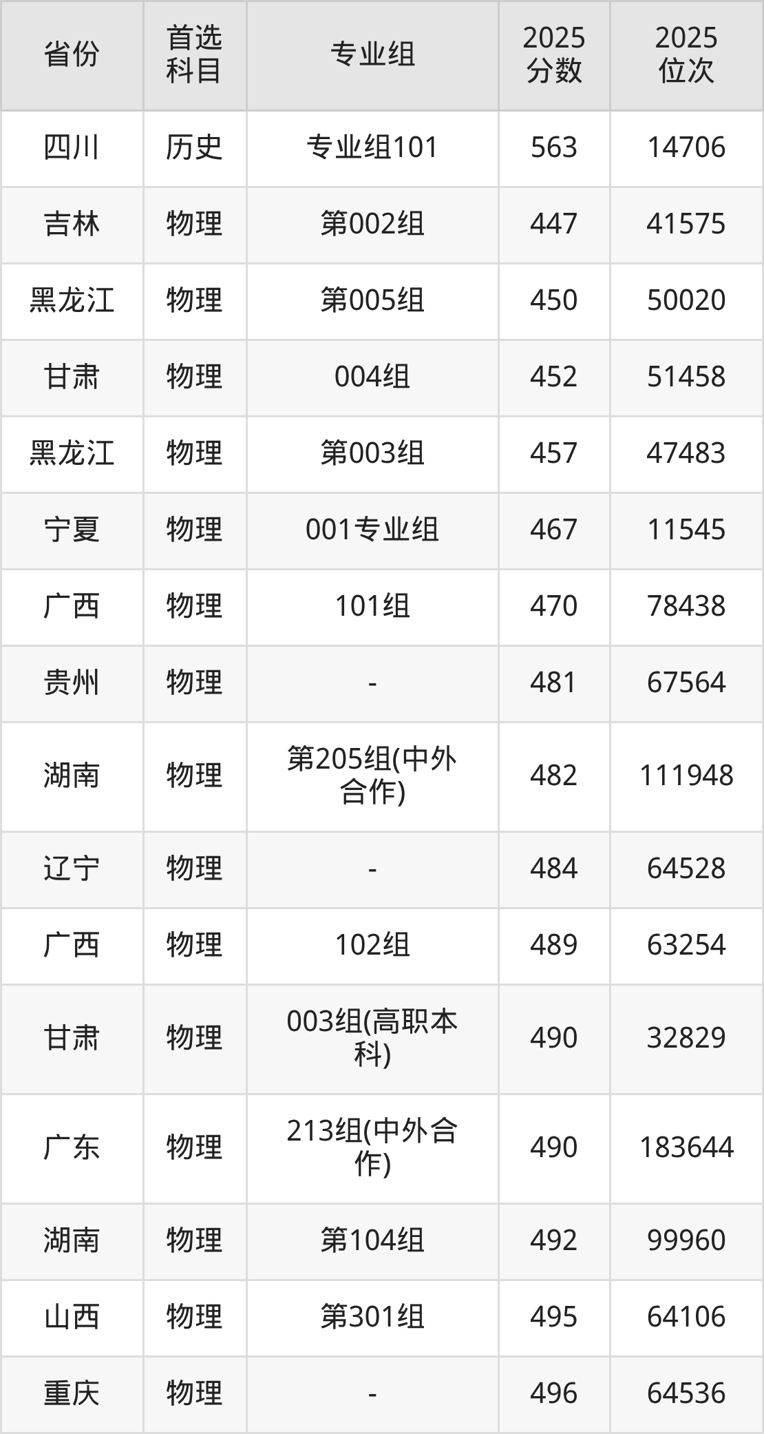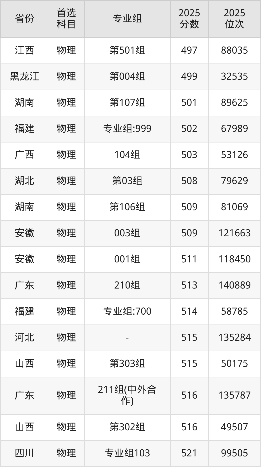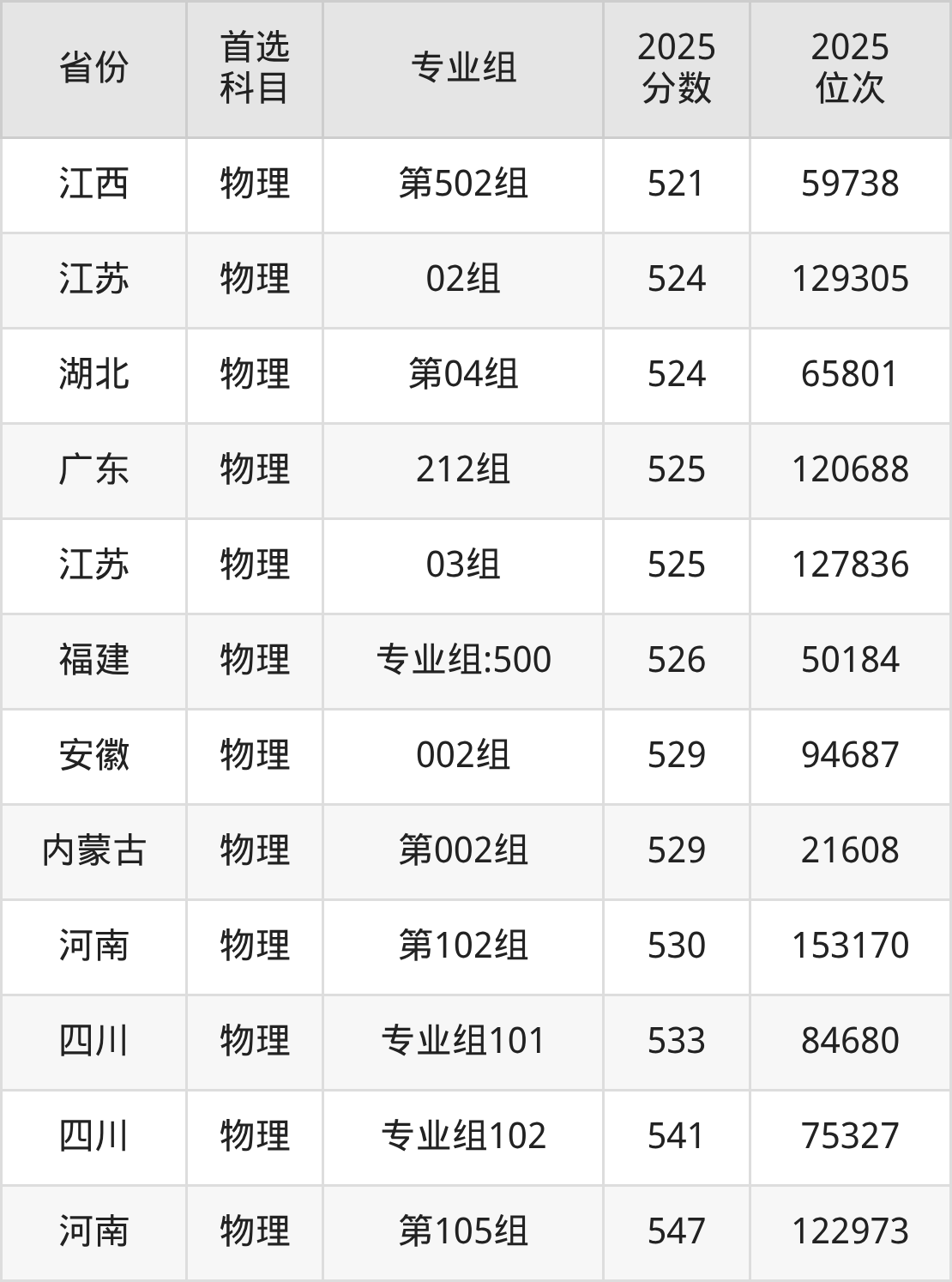 物理类最低分对应地区为吉林(第002组),录取位次为41575,超本科线107分;最高分对应地区为河南(第105组),录取位次为122973。