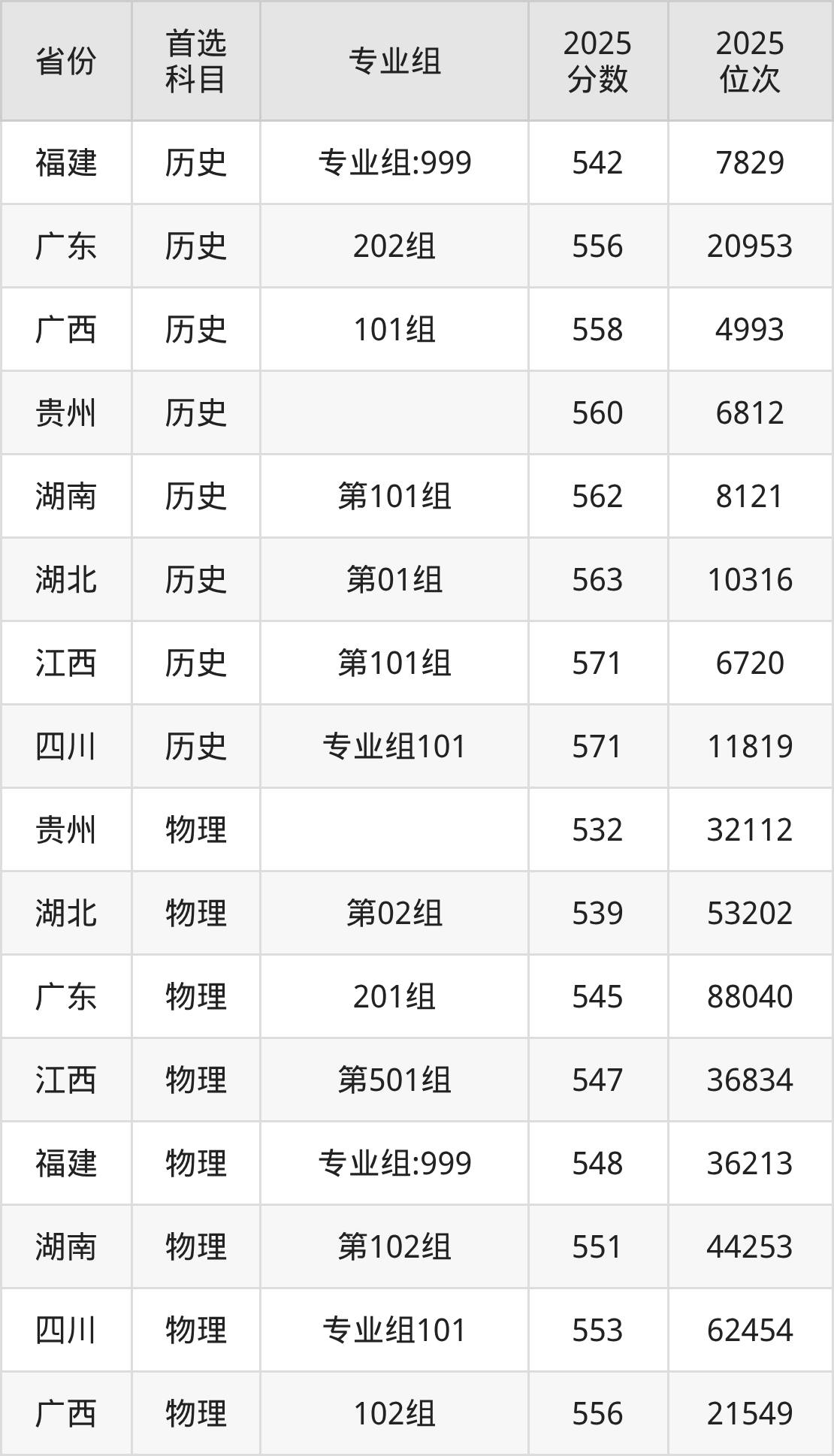 物理类最低分对应地区为贵州,录取位次为32112,超本科线145分;最高分对应地区为广西(102组),录取位次为21549,超本科线186分。