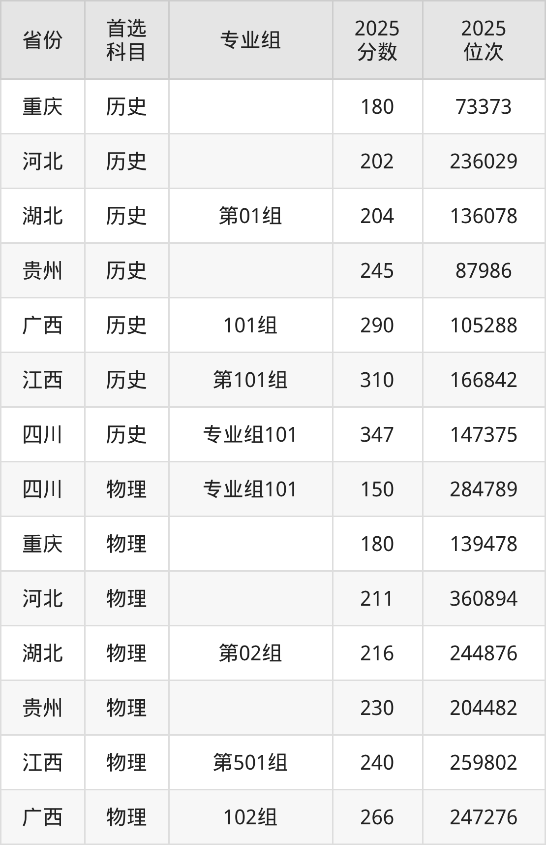 历史类最低分对应地区为重庆,录取位次为73373;最高分对应地区为四川(专业组101),录取位次为147375,超专科线197分。