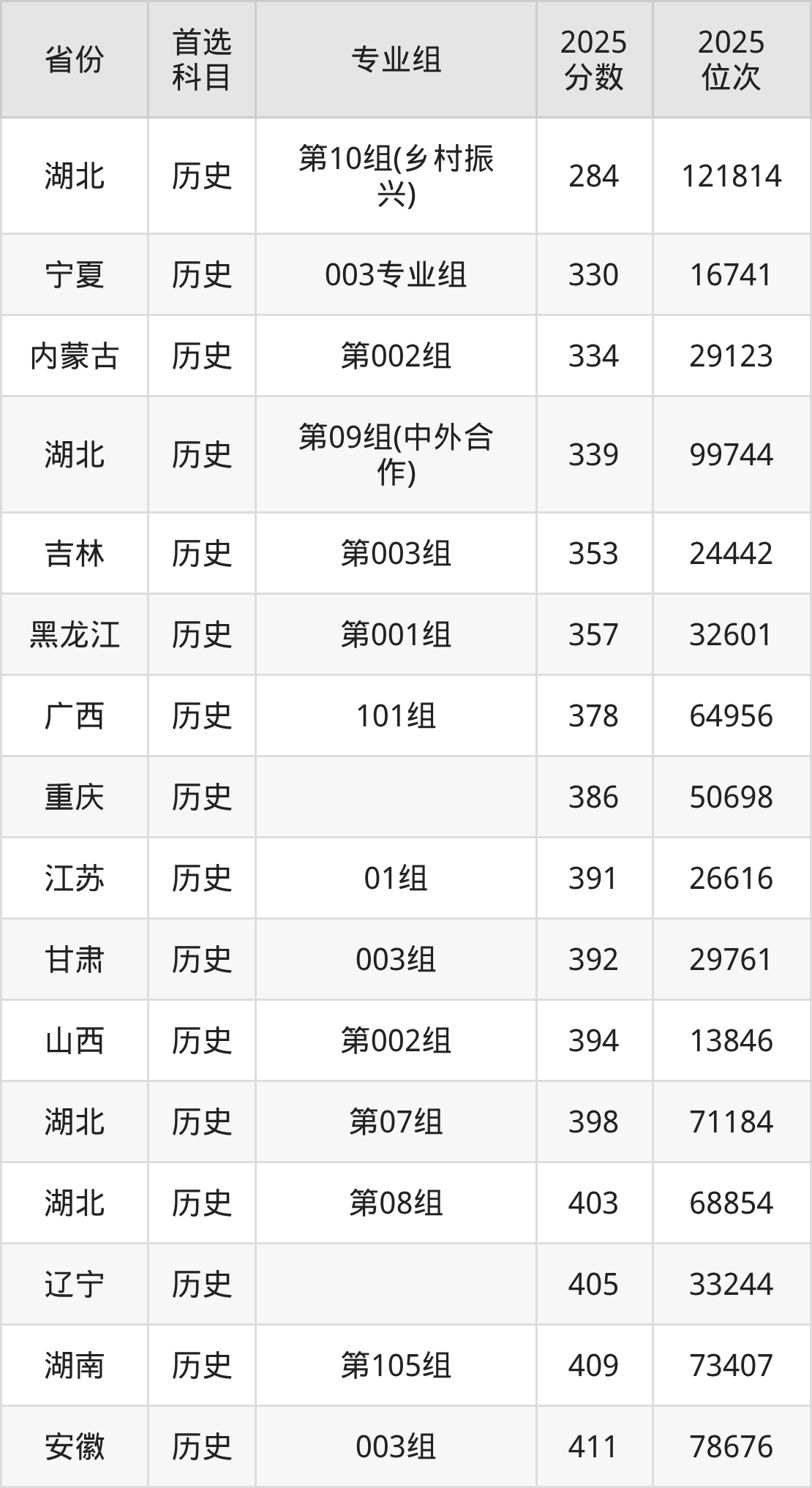 历史类:第06组(乡村振兴)347分、82851名,第07组380分、67358名,第08组398分、59226名,第09组(中外合作)296分、105123名,第10组(高职联办本科)422分、49169名,第11组(高职联办本科)422分、49169名;