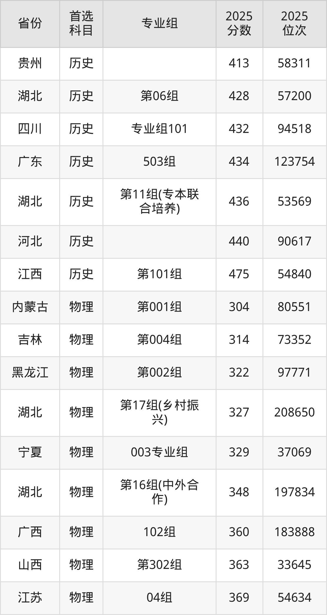 历史类最低分对应地区为湖北(第10组(乡村振兴)),录取位次为121814,超专科线84分;最高分对应地区为江西(第101组),录取位次为54840,超专科线185分。