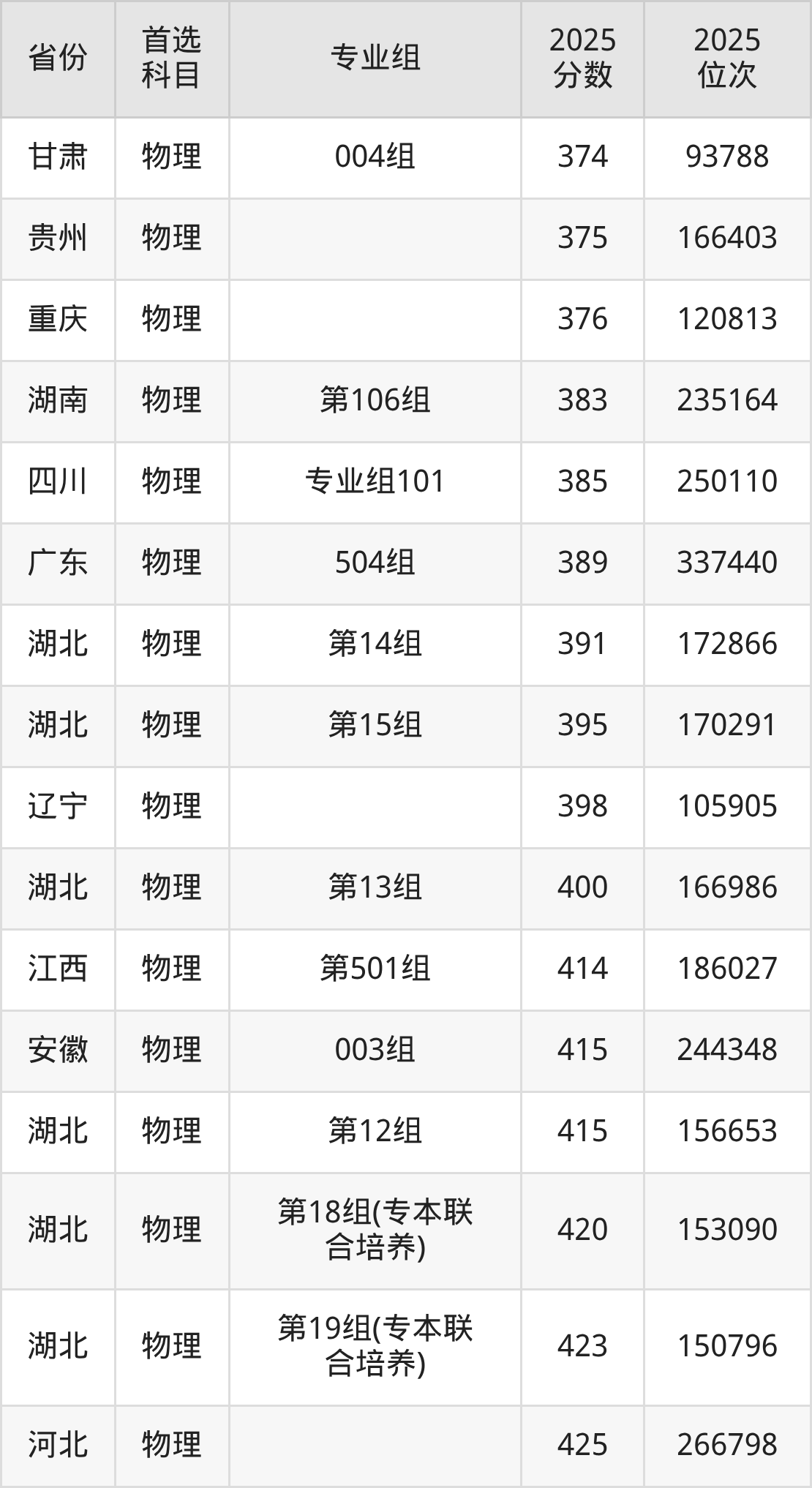 物理类:第12组415分、156653名,第13组400分、166986名,第14组391分、172866名,第15组395分、170291名,第16组(中外合作)348分、197834名,第17组(乡村振兴)327分、208650名,第18组(专本联合培养)420分、153090名,第19组(专本联合培养)423分、150796名,第20组(专本联合培养)425分、149376名;