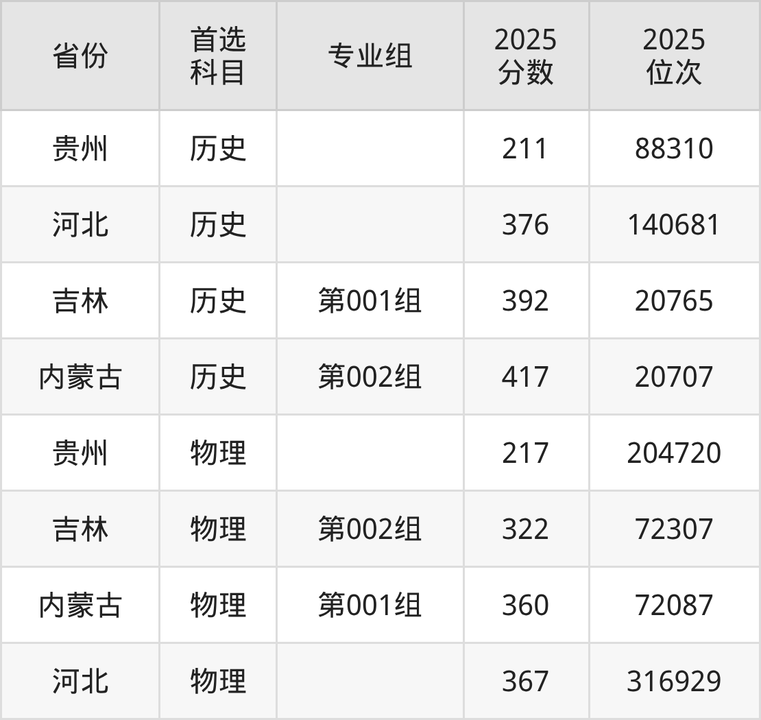 历史类最低分对应地区为贵州,录取位次为88310,超专科线31分;最高分对应地区为内蒙古(第002组),录取位次为20707,超专科线257分。