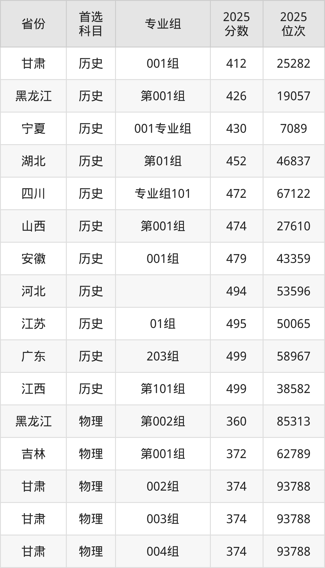 历史类:001组412分、25282名;