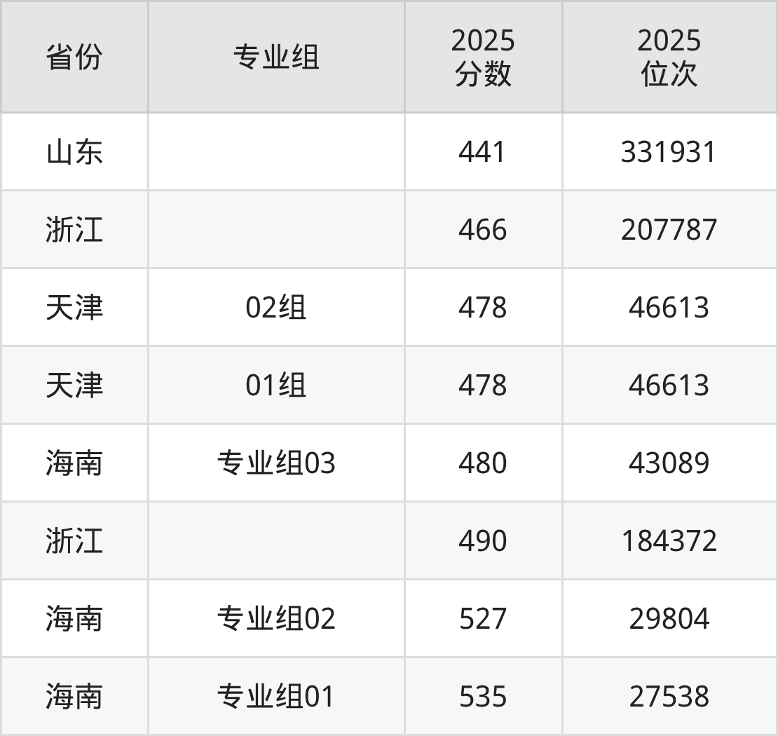 最低分对应地区为山东,录取位次为331931,超一段线1分;最高分对应地区为海南(专业组01),录取位次为27538,超本科线55分。