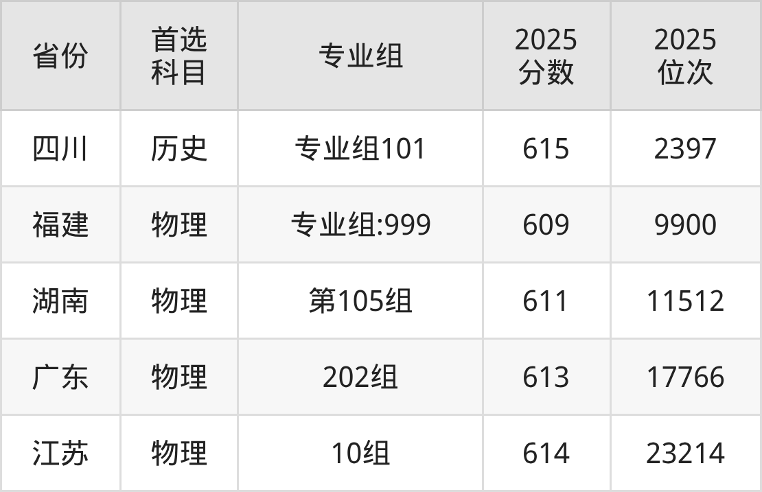 历史类最低分对应地区为四川(专业组101),录取位次为2397,超本科B148分。