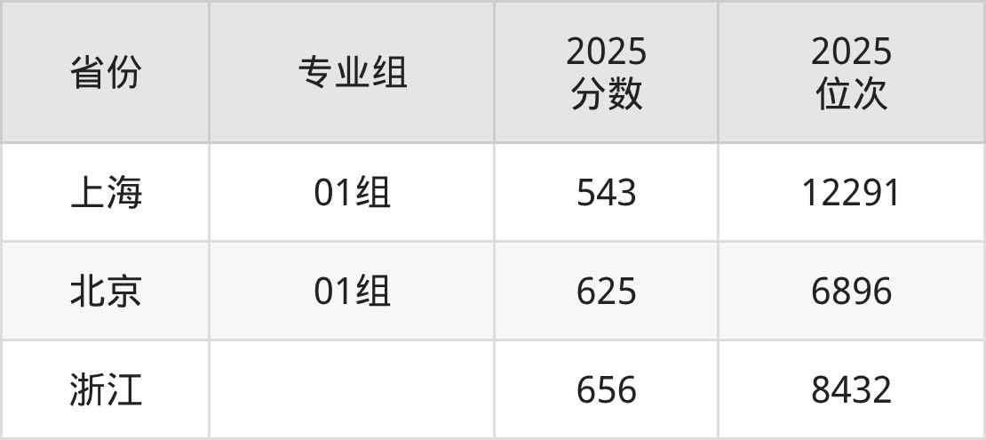 最低分对应地区为上海(01组),录取位次为12291,超本科线141分;最高分对应地区为浙江,录取位次为8432,超一段线166分。