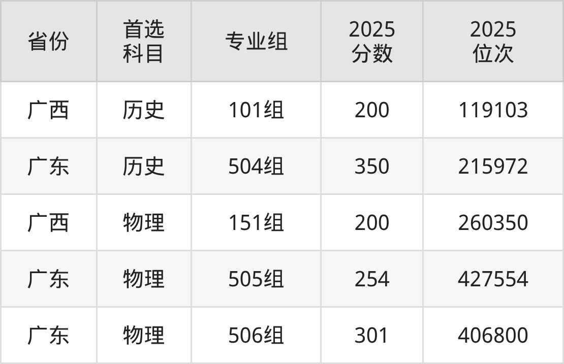 历史类最低分对应地区为广西(101组),录取位次为119103;最高分对应地区为广东(504组),录取位次为215972,超专科线135分。