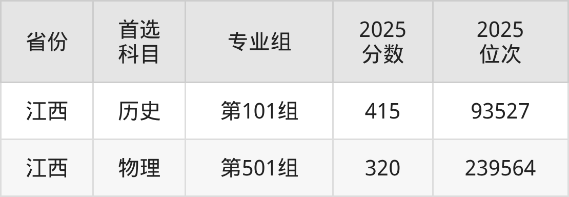 历史类最低分对应地区为江西(第101组),录取位次为93527,超专科线125分。