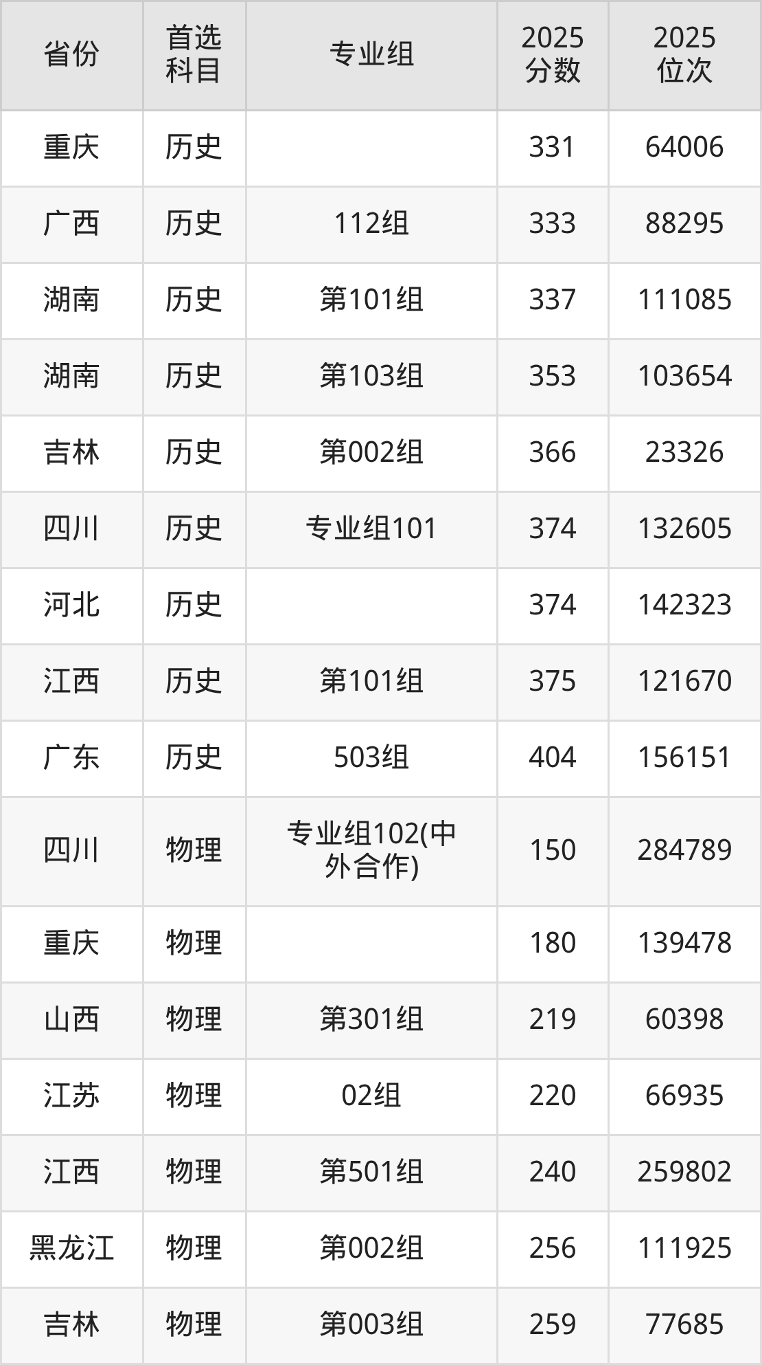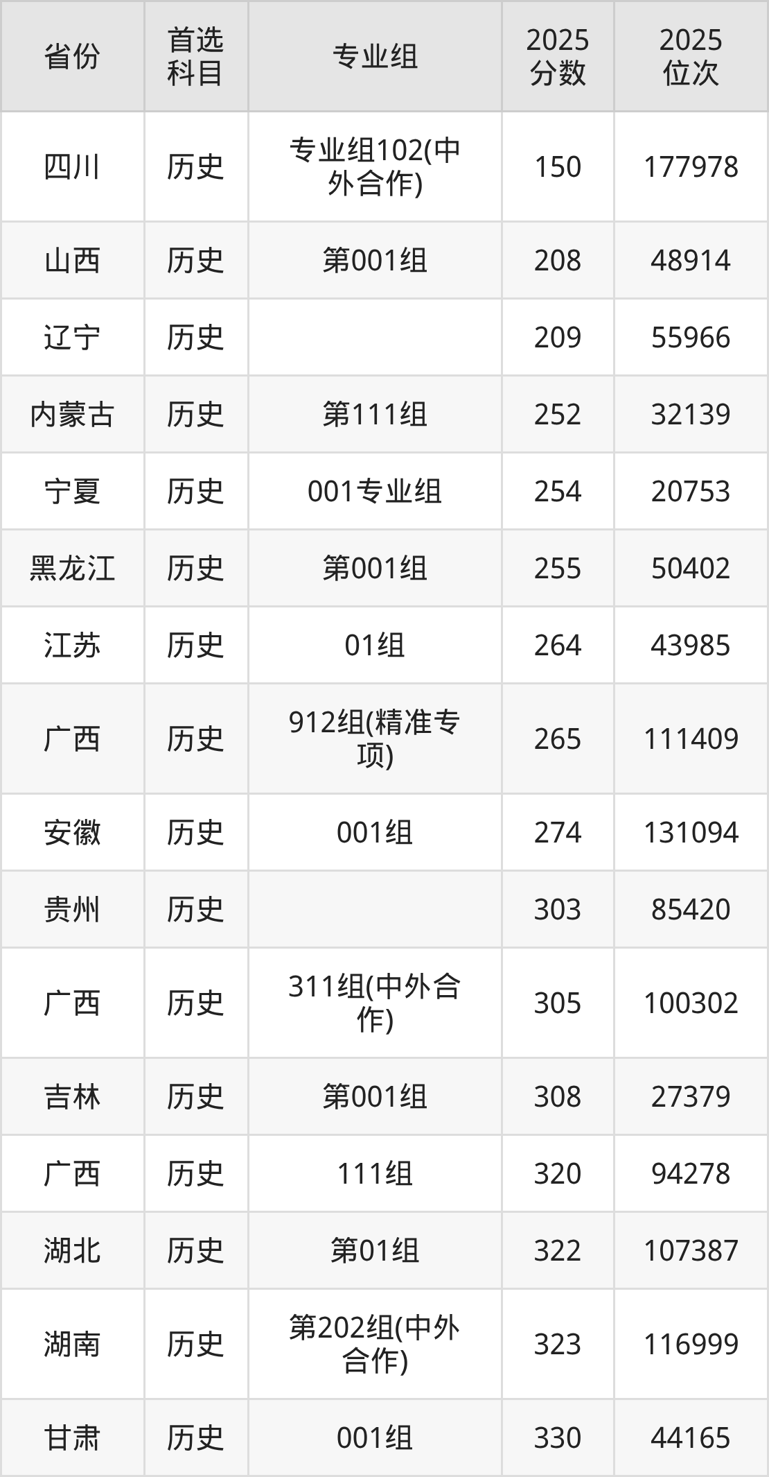 历史类:111组320分、94278名,112组333分、88295名,311组(中外合作)305分、100302名,912组(精准专项)265分、111409名;