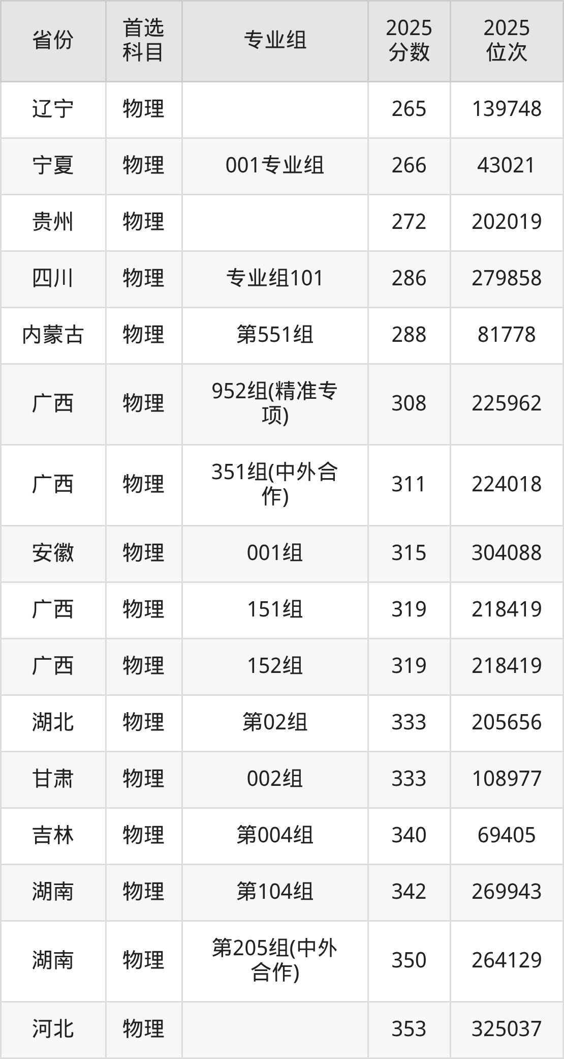 物理类最低分对应地区为四川(专业组102(中外合作)),录取位次为284789;最高分对应地区为湖南(第106组),录取位次为251804,超专科线165分。