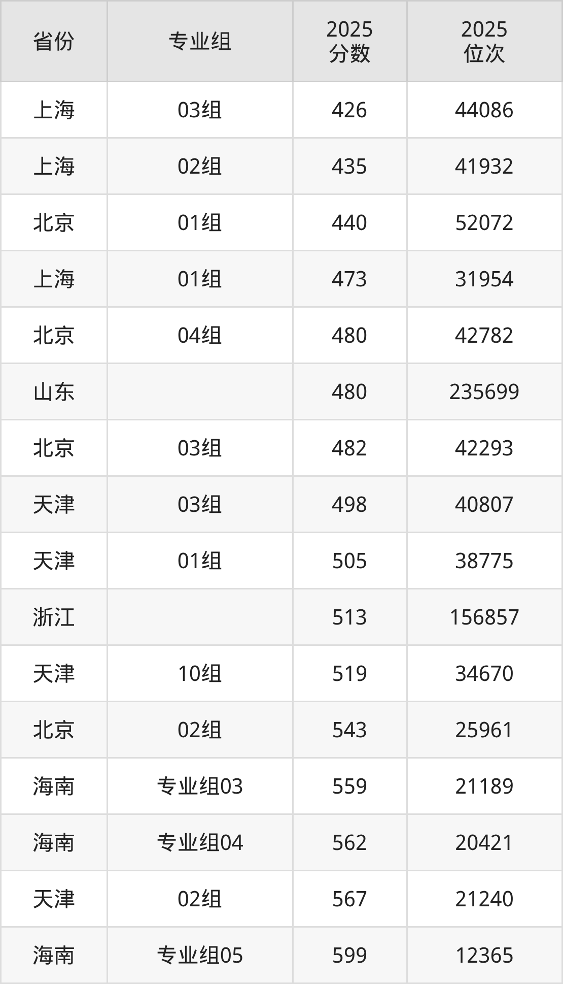 最低分对应地区为上海(03组),录取位次为44086,超本科线24分;最高分对应地区为海南(专业组05),录取位次为12365,超本科线119分。