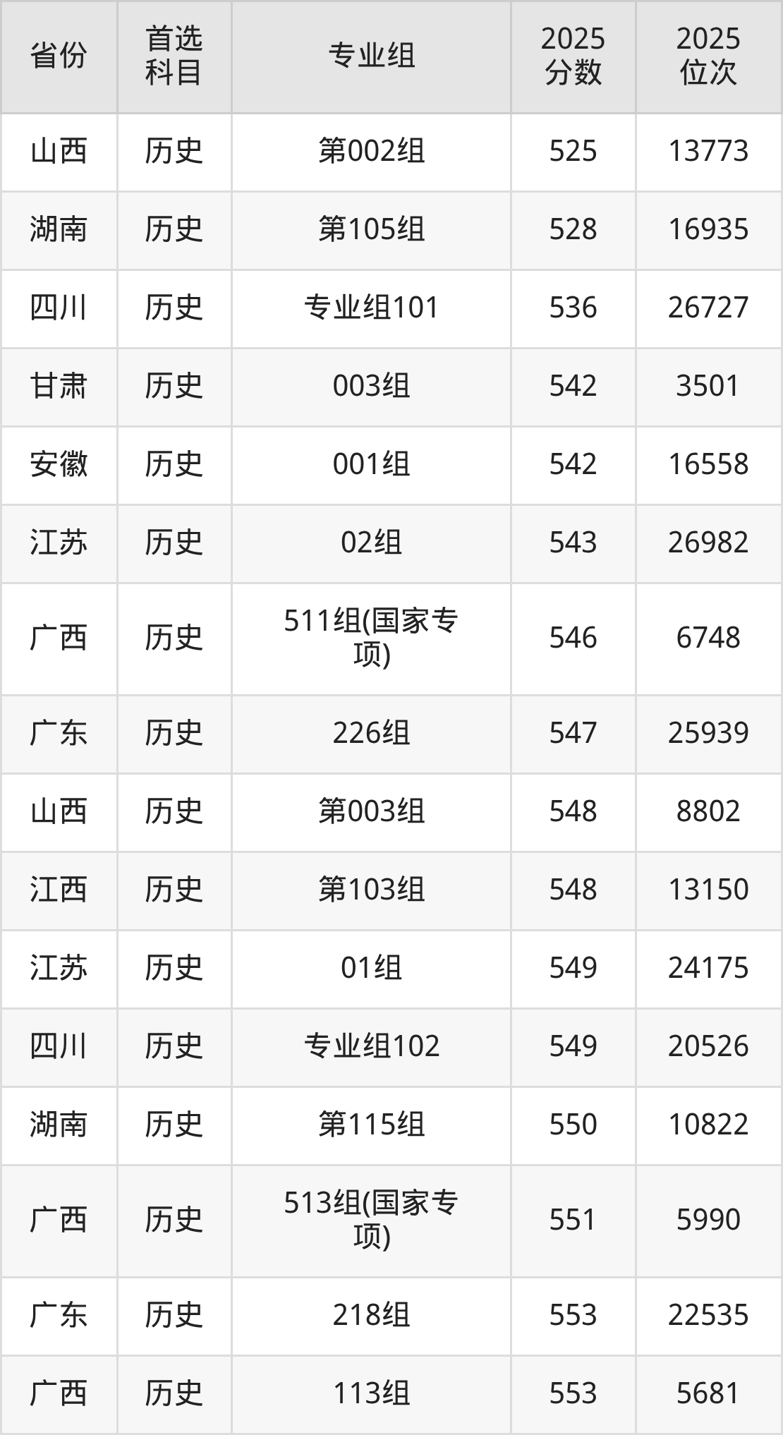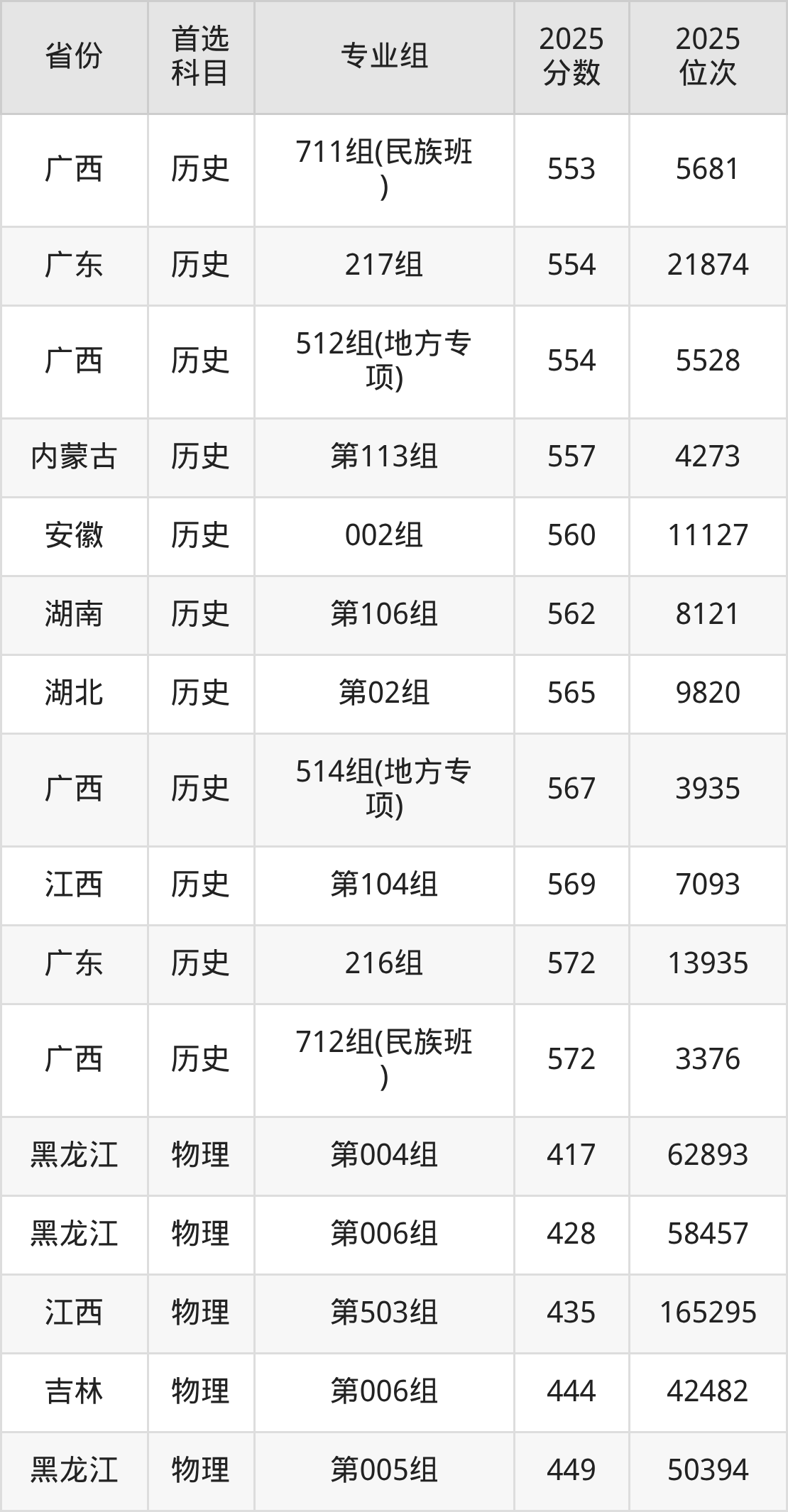 历史类最低分对应地区为甘肃(004组),录取位次为23946,超本科线6分;最高分对应地区为广西(712组(民族班)),录取位次为3376。