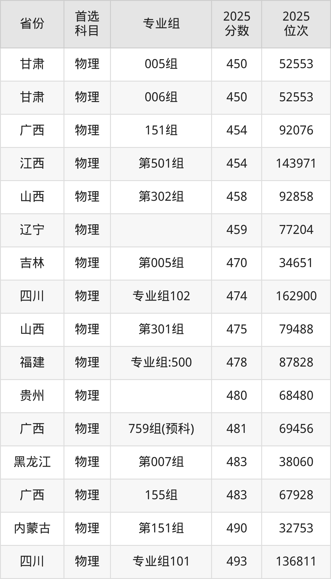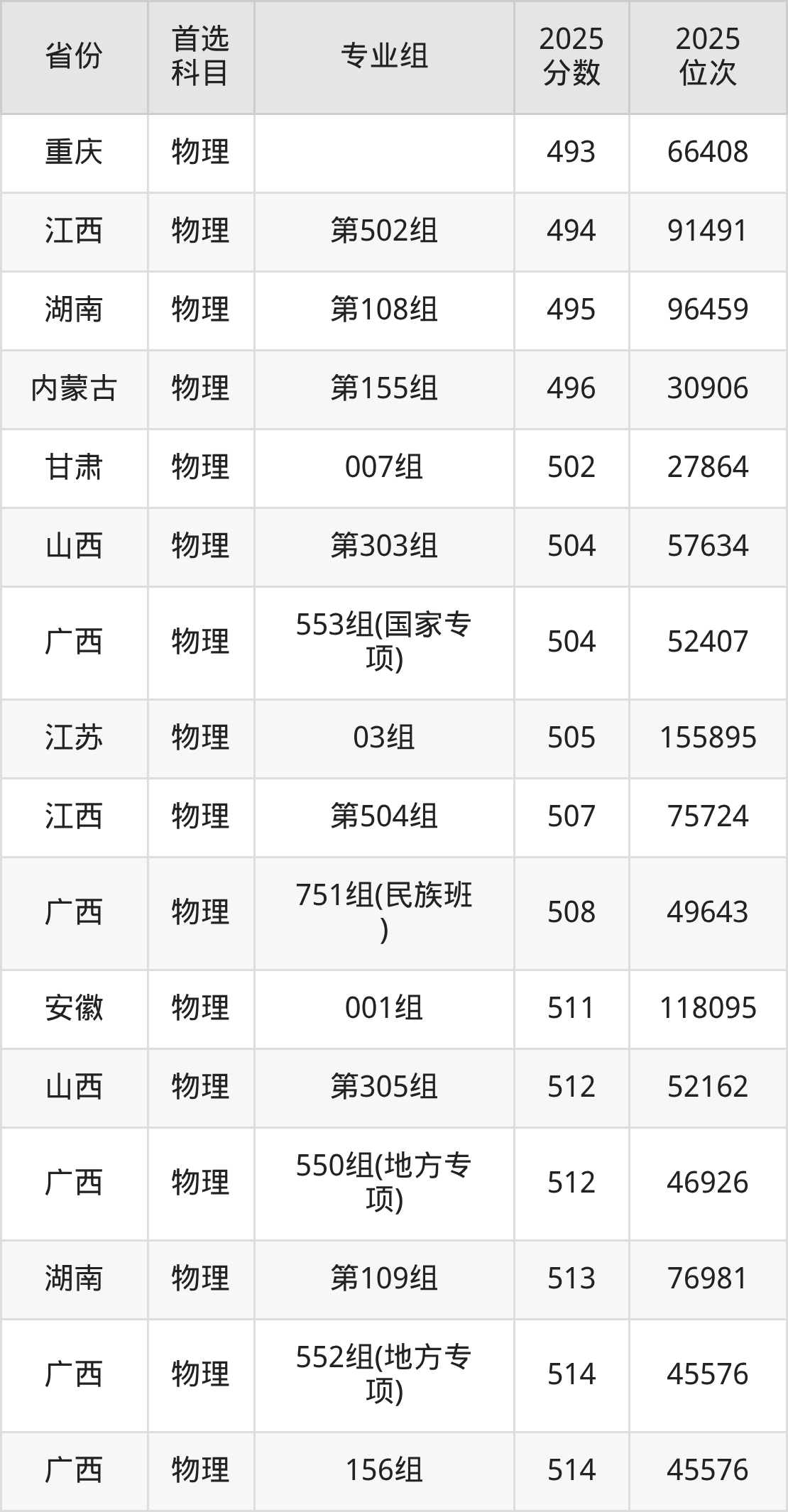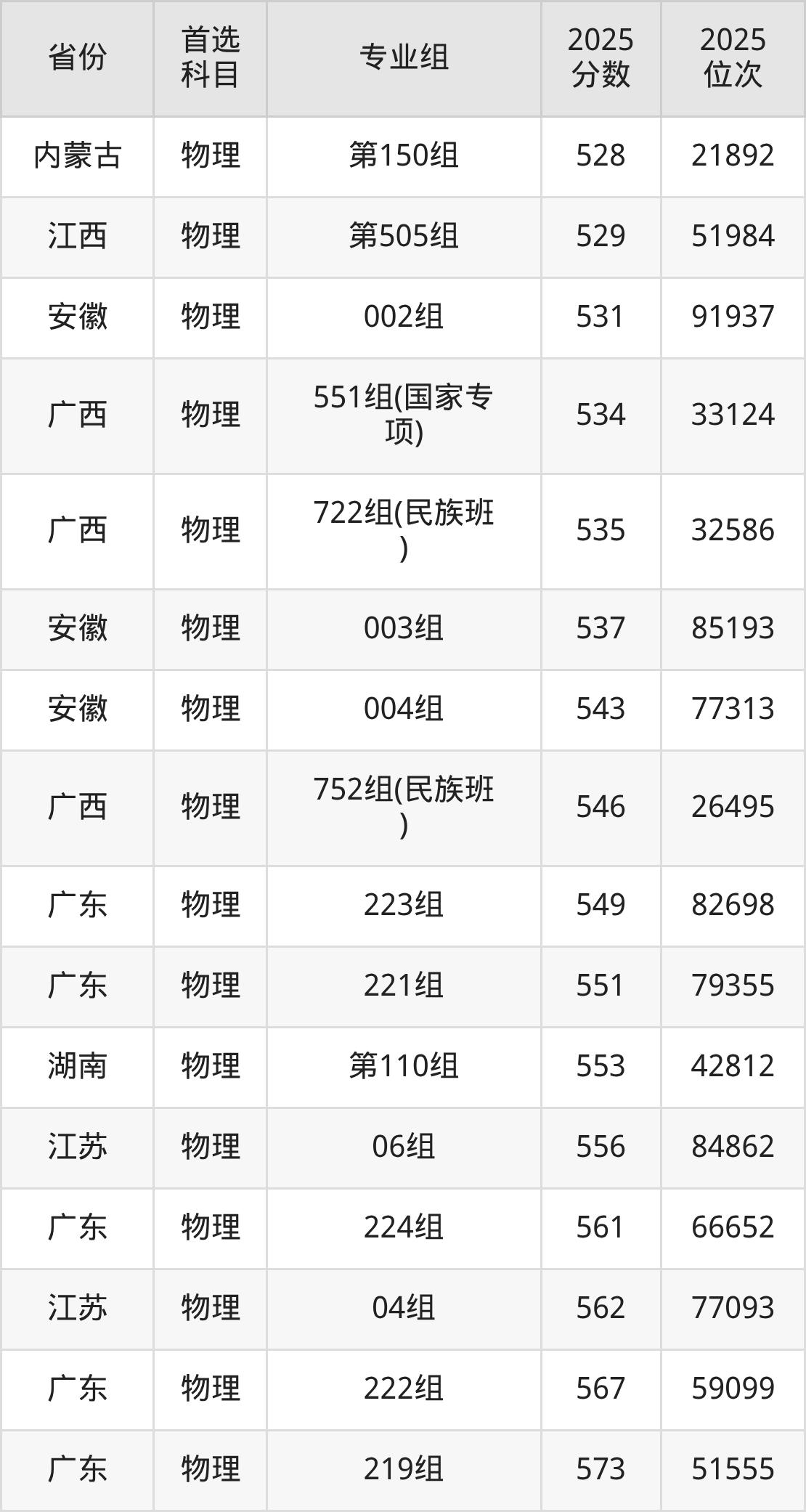 物理类:151组454分、92076名,152组524分、39147名,155组483分、67928名,156组514分、45576名,550组(地方专项)512分、46926名,551组(国家专项)534分、33124名,552组(地方专项)514分、45576名,553组(国家专项)504分、52407名,554组(地方专项)523分、39765名,555组(国家专项)522分、40406名,557组(国家专项)515分、44920名,558组(地方专项)516分、44270名,722组(民族班)535分、32586名,751组(民族班)508分、49643名,752组(民族班)546分、26495名,759组(预科)481分、69456名;