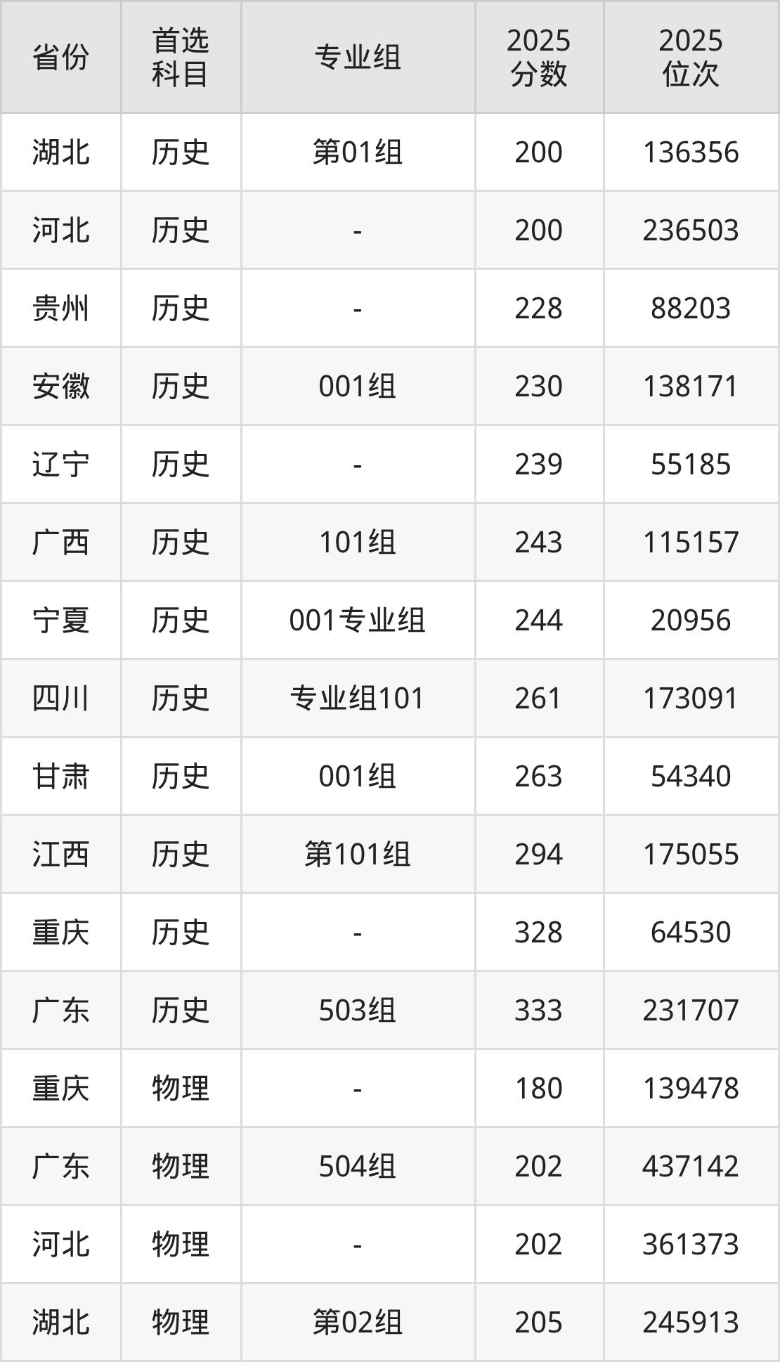 历史类最低分对应地区为湖北(第01组),录取位次为136356;最高分对应地区为广东(503组),录取位次为231707,超专科线118分。