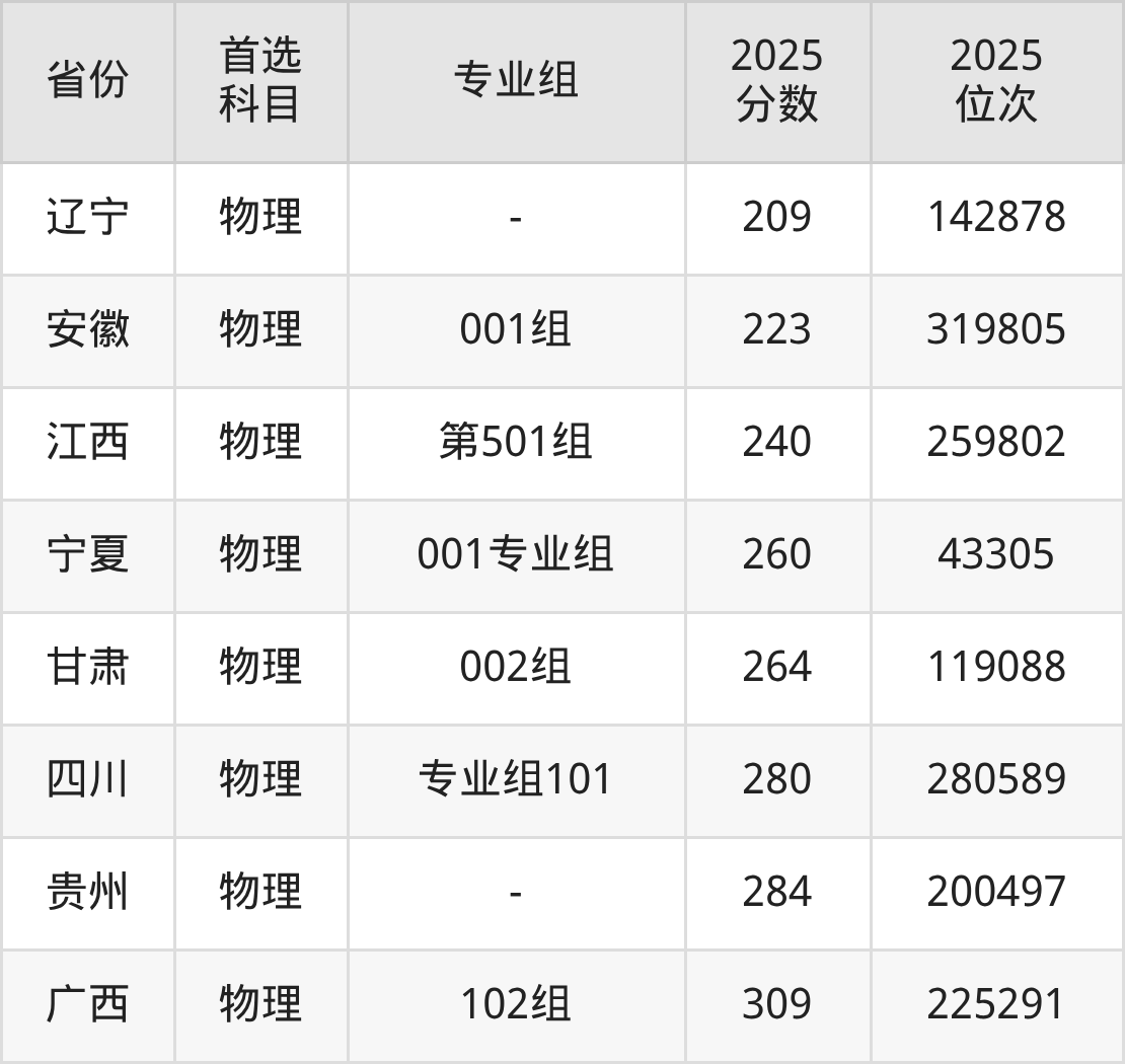 物理类最低分对应地区为重庆,录取位次为139478;最高分对应地区为广西(102组),录取位次为225291,超专科线109分。