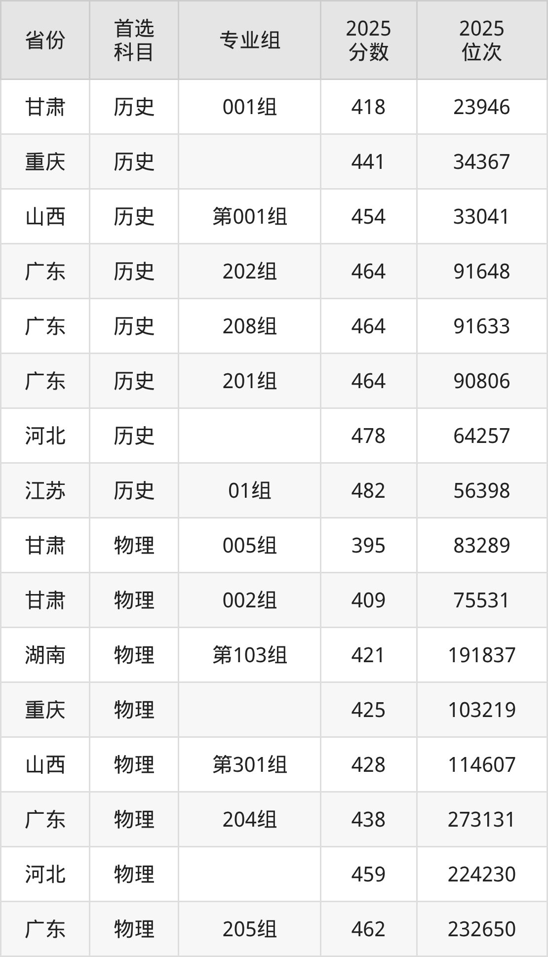 物理类最低分对应地区为甘肃(005组),录取位次为83289,超本科线21分;最高分对应地区为广东(210组),录取位次为209193,超本科线39分。