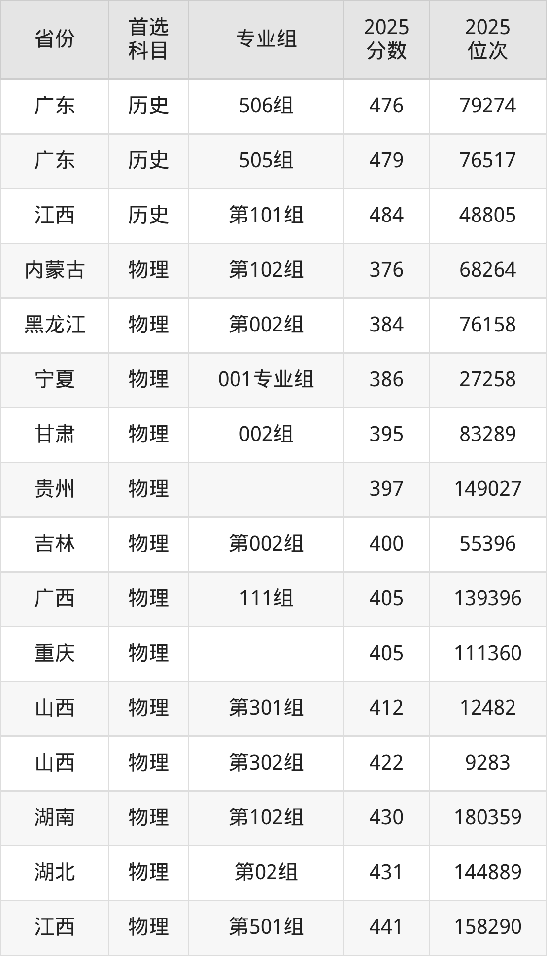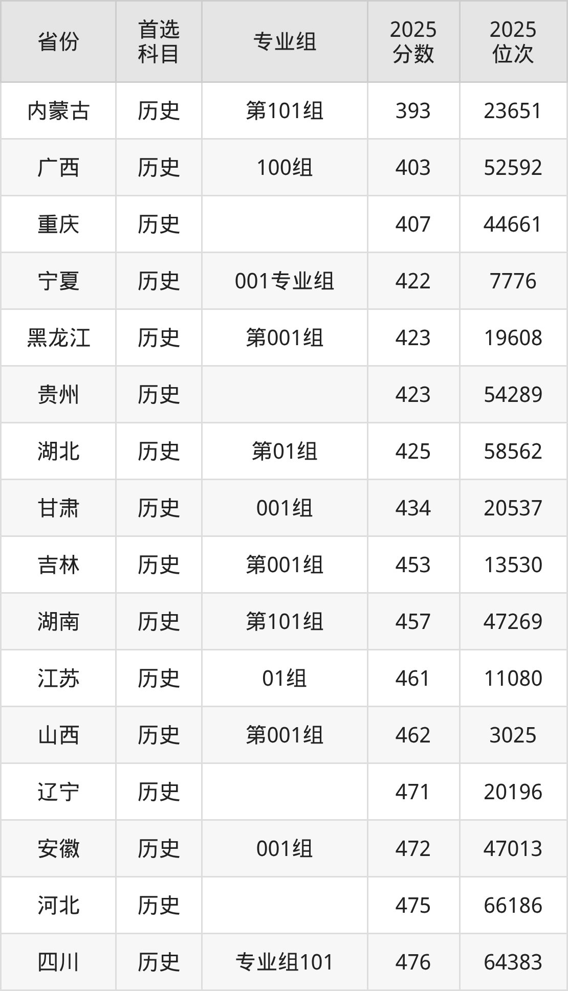历史类最低分对应地区为内蒙古(第101组),录取位次为23651,超专科线233分;最高分对应地区为江西(第101组),录取位次为48805,超专科线194分。
