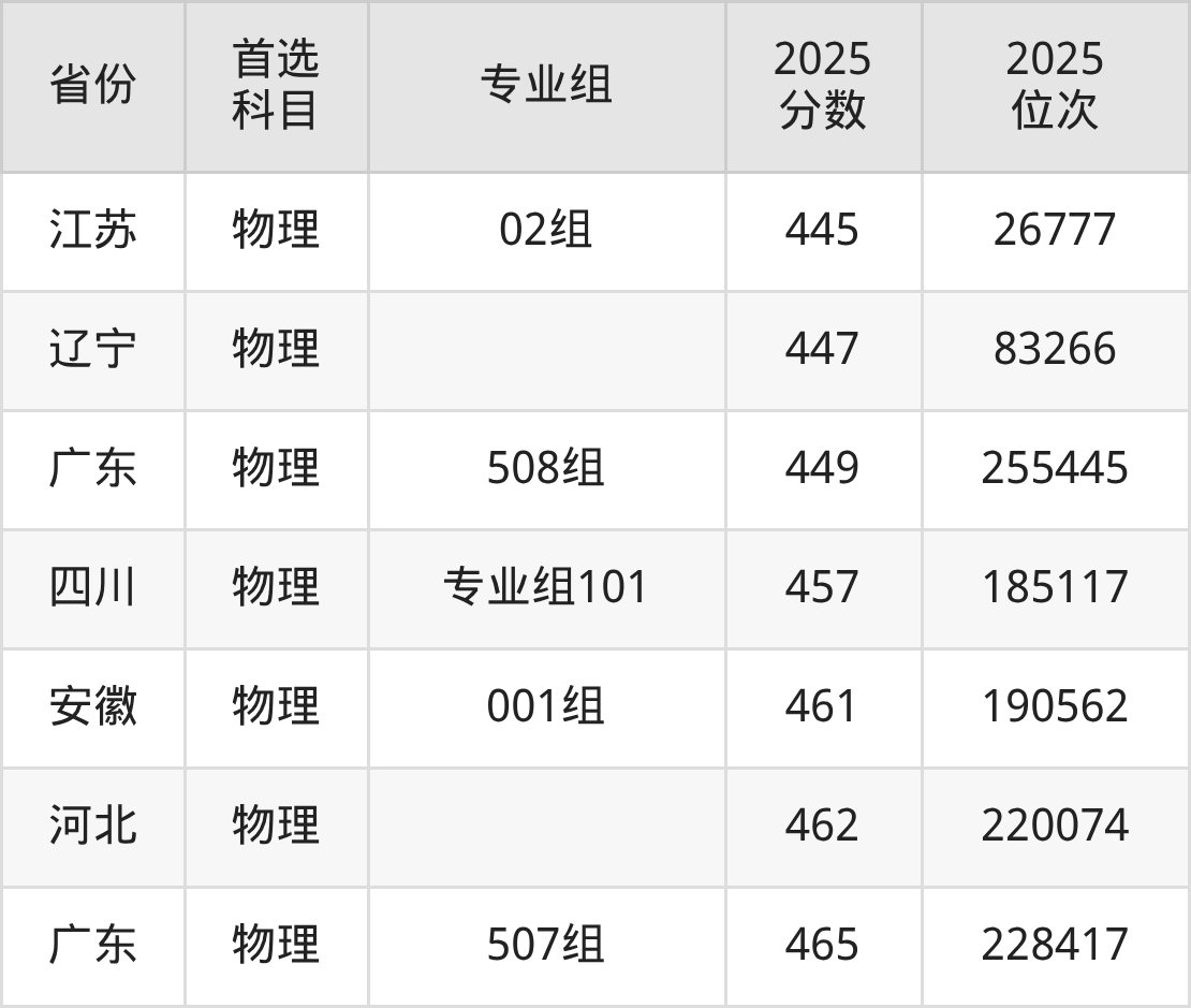 物理类最低分对应地区为内蒙古(第102组),录取位次为68264,超专科线216分;最高分对应地区为广东(507组),录取位次为228417,超专科线265分。